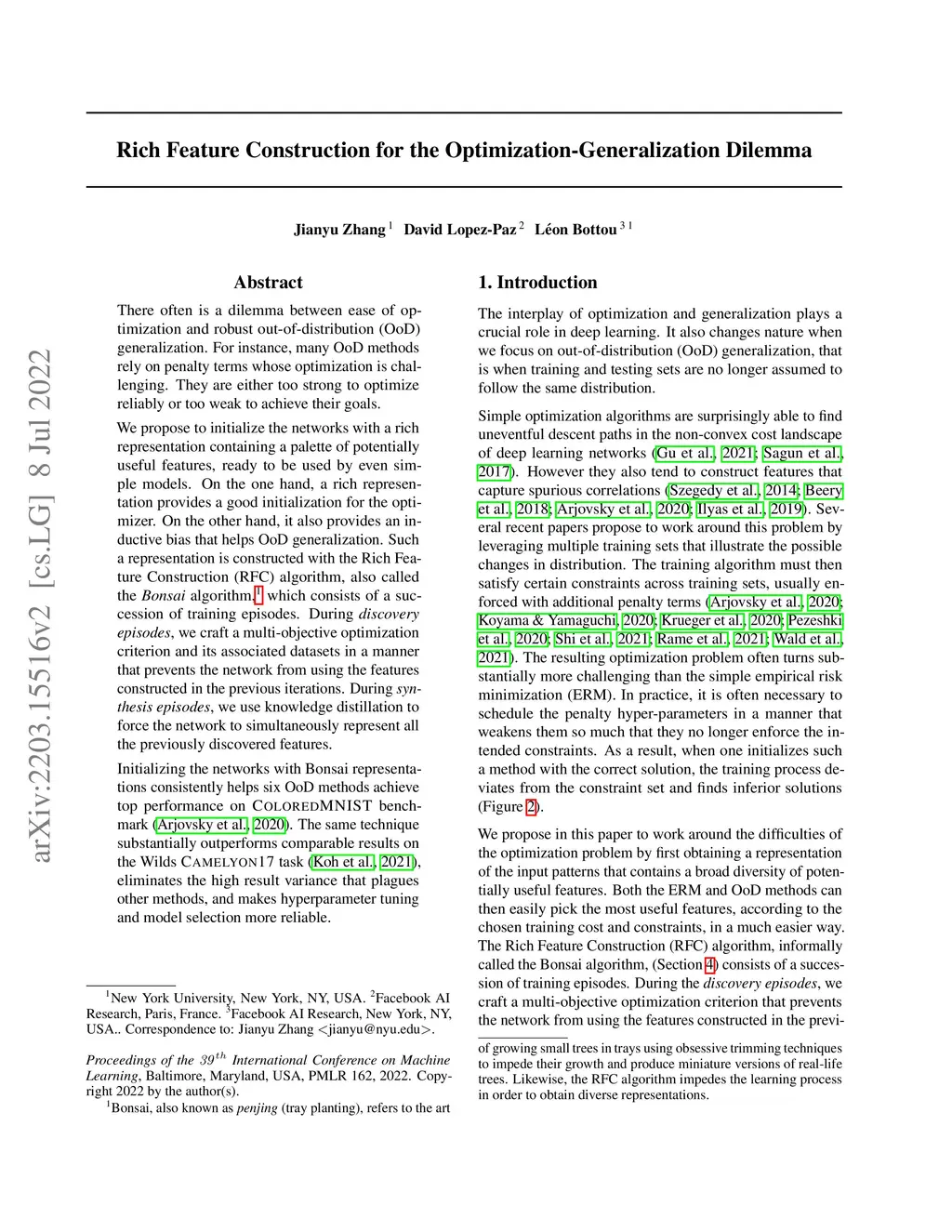 There often is a dilemma between ease of optimization and robust out-of-distribution (OoD) generalization. For instance, many OoD methods rely on penalty terms whose optimization is challenging. They are either too strong to optimize reliably or too weak to achieve their goals. We propose to initialize the networks with a rich representation containing a palette of potentially useful features, ready to be used by even simple models. On the one hand, a rich representation provides a good initialization for the optimizer. On the other hand, it also provides an inductive bias that helps OoD generalization. Such a representation is constructed with the Rich Feature Construction (RFC) algorithm, also called the Bonsai algorithm, which consists of a succession of training episodes. During discovery episodes, we craft a multi-objective optimization criterion and its associated datasets in a manner that prevents the network from using the features constructed in the previous iterations. During synthesis episodes, we use knowledge distillation to force the network to simultaneously represent all the previously discovered features. Initializing the networks with Bonsai representations consistently helps six OoD methods achieve top performance on ColoredMNIST benchmark. The same technique substantially outperforms comparable results on the Wilds Camelyon17 task, eliminates the high result variance that plagues other methods, and makes hyperparameter tuning and model selection more reliable.