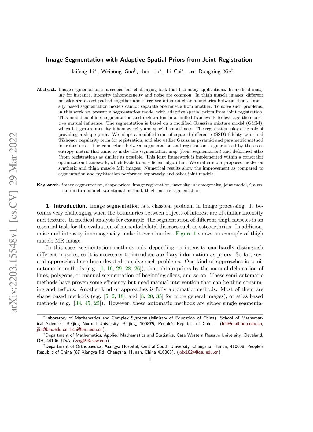 Image segmentation is a crucial but challenging task that has many applications. In medical imaging for instance, intensity inhomogeneity and noise are common. In thigh muscle images, different muscles are closed packed together and there are often no clear boundaries between them. Intensity based segmentation models cannot separate one muscle from another. To solve such problems, in this work we present a segmentation model with adaptive spatial priors from joint registration. This model combines segmentation and registration in a unified framework to leverage their positive mutual influence. The segmentation is based on a modified Gaussian mixture model (GMM), which integrates intensity inhomogeneity and spacial smoothness. The registration plays the role of providing a shape prior. We adopt a modified sum of squared difference (SSD) fidelity term and Tikhonov regularity term for registration, and also utilize Gaussian pyramid and parametric method for robustness. The connection between segmentation and registration is guaranteed by the cross entropy metric that aims to make the segmentation map (from segmentation) and deformed atlas (from registration) as similar as possible. This joint framework is implemented within a constraint optimization framework, which leads to an efficient algorithm. We evaluate our proposed model on synthetic and thigh muscle MR images. Numerical results show the improvement as compared to segmentation and registration performed separately and other joint models.