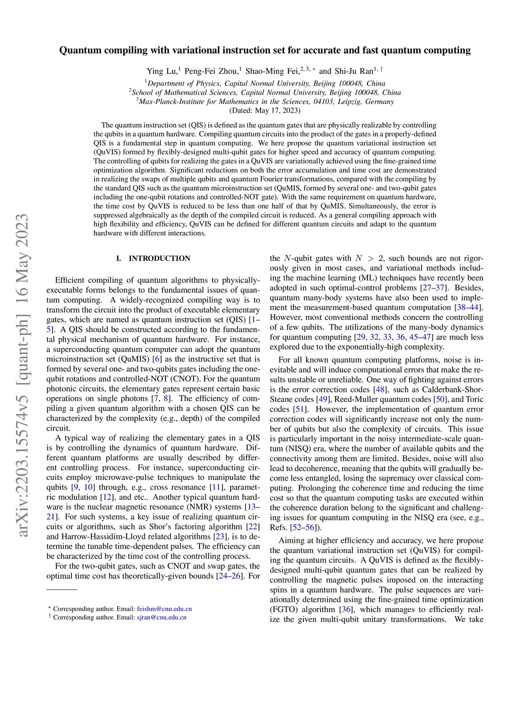The quantum instruction set (QIS) is defined as the quantum gates that are physically realizable by controlling the qubits in quantum hardware. Compiling quantum circuits into the product of the gates in a properly defined QIS is a fundamental step in quantum computing. We here propose the quantum variational instruction set (QuVIS) formed by flexibly designed multi-qubit gates for higher speed and accuracy of quantum computing. The controlling of qubits for realizing the gates in a QuVIS is variationally achieved using the fine-grained time optimization algorithm. Significant reductions in both the error accumulation and time cost are demonstrated in realizing the swaps of multiple qubits and quantum Fourier transformations, compared with the compiling by a standard QIS such as the quantum microinstruction set (QuMIS, formed by several one- and two-qubit gates including one-qubit rotations and controlled-NOT gates). With the same requirement on quantum hardware, the time cost for QuVIS is reduced to less than one half of that for QuMIS. Simultaneously, the error is suppressed algebraically as the depth of the compiled circuit is reduced. As a general compiling approach with high flexibility and efficiency, QuVIS can be defined for different quantum circuits and be adapted to the quantum hardware with different interactions.