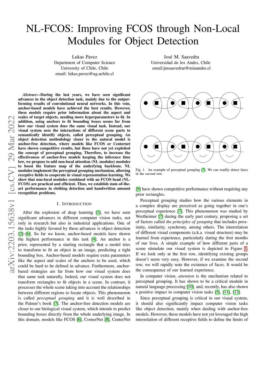 During the last years, we have seen significant advances in the object detection task, mainly due to the outperforming results of convolutional neural networks. In this vein, anchor-based models have achieved the best results. However, these models require prior information about the aspect and scales of target objects, needing more hyperparameters to fit. In addition, using anchors to fit bounding boxes seems far from how our visual system does the same visual task. Instead, our visual system uses the interactions of different scene parts to semantically identify objects, called perceptual grouping. An object detection methodology closer to the natural model is anchor-free detection, where models like FCOS or Centernet have shown competitive results, but these have not yet exploited the concept of perceptual grouping. Therefore, to increase the effectiveness of anchor-free models keeping the inference time low, we propose to add non-local attention (NL modules) modules to boost the feature map of the underlying backbone. NL modules implement the perceptual grouping mechanism, allowing receptive fields to cooperate in visual representation learning. We show that non-local modules combined with an FCOS head (NL-FCOS) are practical and efficient. Thus, we establish state-of-the-art performance in clothing detection and handwritten amount recognition problems.