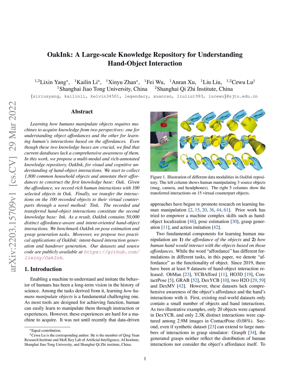 OakInk: A Large-scale Knowledge Repository for Understanding Hand-Object