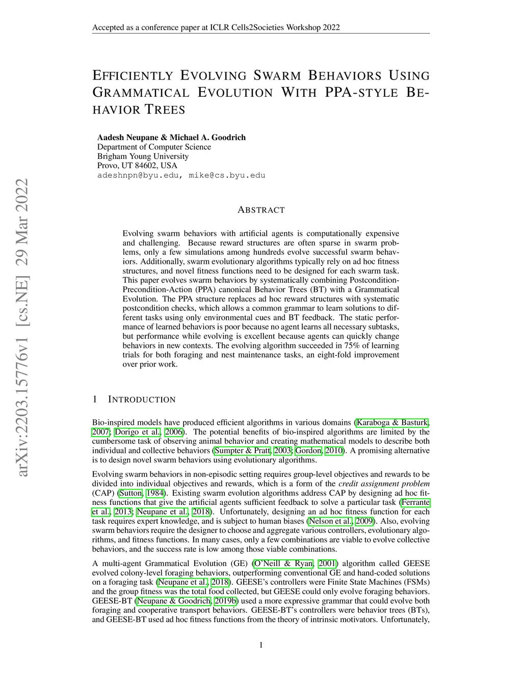 Evolving swarm behaviors with artificial agents is computationally expensive and challenging. Because reward structures are often sparse in swarm problems, only a few simulations among hundreds evolve successful swarm behaviors. Additionally, swarm evolutionary algorithms typically rely on ad hoc fitness structures, and novel fitness functions need to be designed for each swarm task. This paper evolves swarm behaviors by systematically combining Postcondition-Precondition-Action (PPA) canonical Behavior Trees (BT) with a Grammatical Evolution. The PPA structure replaces ad hoc reward structures with systematic postcondition checks, which allows a common grammar to learn solutions to different tasks using only environmental cues and BT feedback. The static performance of learned behaviors is poor because no agent learns all necessary subtasks, but performance while evolving is excellent because agents can quickly change behaviors in new contexts. The evolving algorithm succeeded in 75\% of learning trials for both foraging and nest maintenance tasks, an eight-fold improvement over prior work.