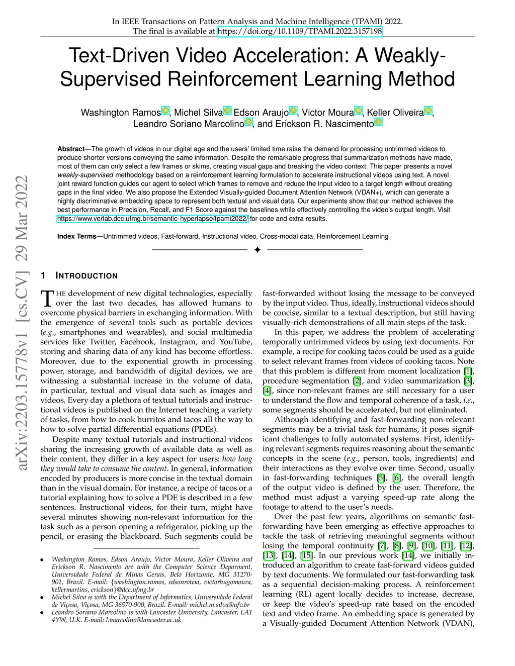The growth of videos in our digital age and the users' limited time raise the demand for processing untrimmed videos to produce shorter versions conveying the same information. Despite the remarkable progress that summarization methods have made, most of them can only select a few frames or skims, creating visual gaps and breaking the video context. This paper presents a novel weakly-supervised methodology based on a reinforcement learning formulation to accelerate instructional videos using text. A novel joint reward function guides our agent to select which frames to remove and reduce the input video to a target length without creating gaps in the final video. We also propose the Extended Visually-guided Document Attention Network (VDAN+), which can generate a highly discriminative embedding space to represent both textual and visual data. Our experiments show that our method achieves the best performance in Precision, Recall, and F1 Score against the baselines while effectively controlling the video's output length. Visit https://www.verlab.dcc.ufmg.br/semantic-hyperlapse/tpami2022/ for code and extra results.