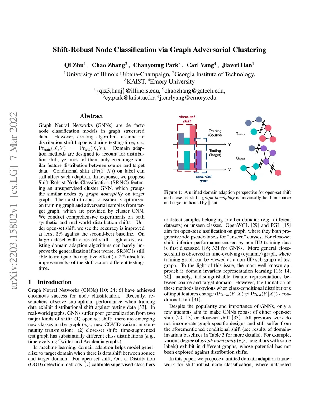 Graph Neural Networks (GNNs) are de facto node classification models in graph structured data. However, during testing-time, these algorithms assume no data shift, i.e., . Domain adaption methods can be adopted for data shift, yet most of them are designed to only encourage similar feature distribution between source and target data. Conditional shift on classes can still affect such adaption. Fortunately, graph yields graph homophily across different data distributions. In response, we propose Shift-Robust Node Classification (SRNC) to address these limitations. We introduce an unsupervised cluster GNN on target graph to group the similar nodes by graph homophily. An adversarial loss with label information on source graph is used upon clustering objective. Then a shift-robust classifier is optimized on training graph and adversarial samples on target graph, which are generated by cluster GNN. We conduct experiments on both open-set shift and representation-shift, which demonstrates the superior accuracy of SRNC on generalizing to test graph with data shift. SRNC is consistently better than previous SoTA domain adaption algorithm on graph that progressively use model predictions on target graph for training.