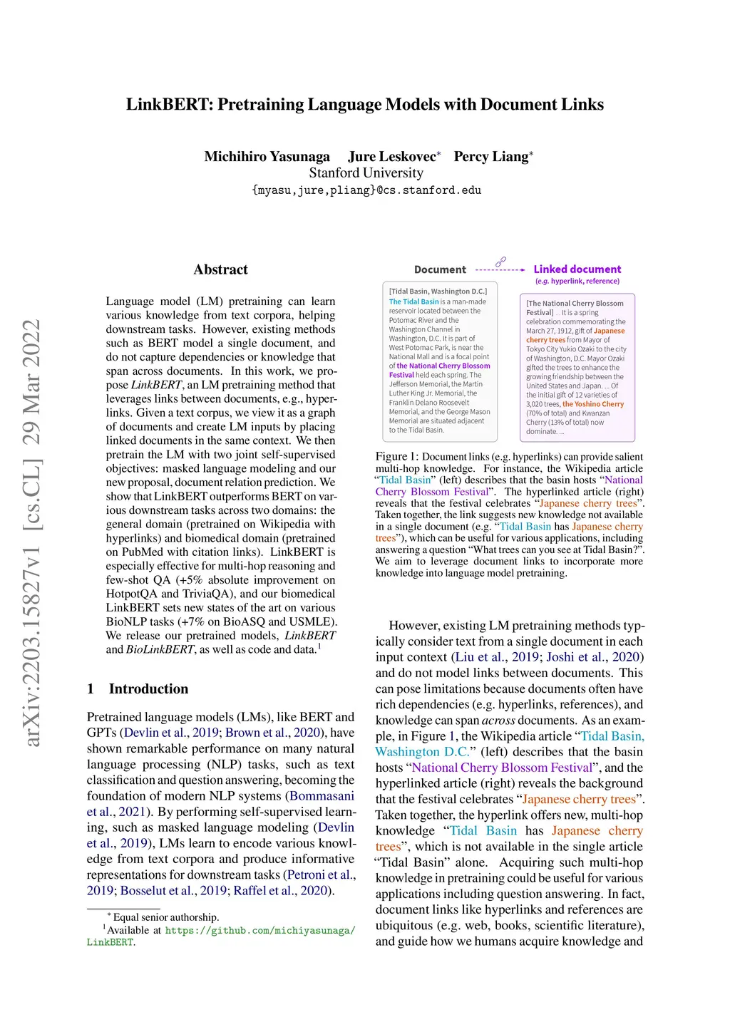 LinkBERT: Pretraining Language Models with Document Links