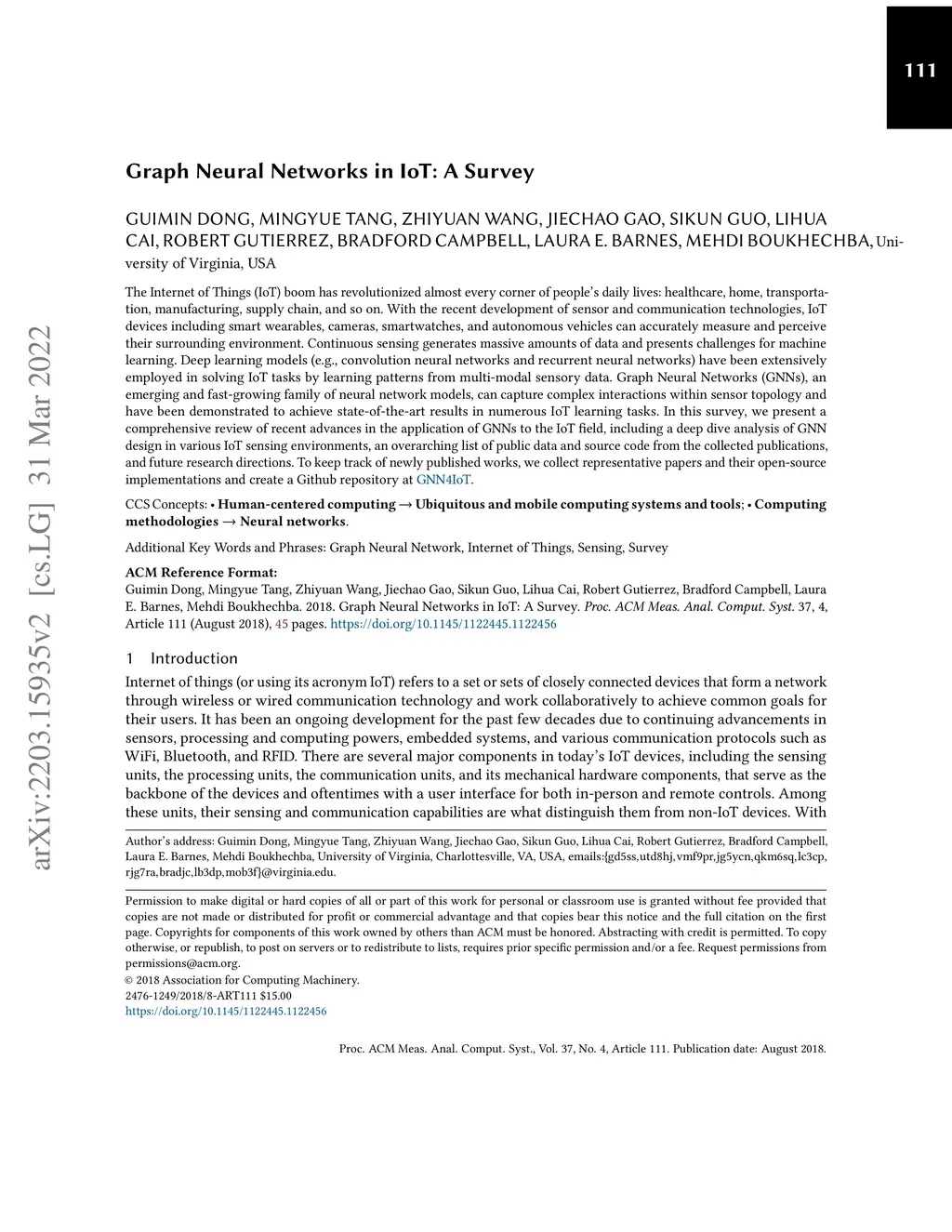 The Internet of Things (IoT) boom has revolutionized almost every corner of people's daily lives: healthcare, home, transportation, manufacturing, supply chain, and so on. With the recent development of sensor and communication technologies, IoT devices including smart wearables, cameras, smartwatches, and autonomous vehicles can accurately measure and perceive their surrounding environment. Continuous sensing generates massive amounts of data and presents challenges for machine learning. Deep learning models (e.g., convolution neural networks and recurrent neural networks) have been extensively employed in solving IoT tasks by learning patterns from multi-modal sensory data. Graph Neural Networks (GNNs), an emerging and fast-growing family of neural network models, can capture complex interactions within sensor topology and have been demonstrated to achieve state-of-the-art results in numerous IoT learning tasks. In this survey, we present a comprehensive review of recent advances in the application of GNNs to the IoT field, including a deep dive analysis of GNN design in various IoT sensing environments, an overarching list of public data and source code from the collected publications, and future research directions. To keep track of newly published works, we collect representative papers and their open-source implementations and create a Github repository at https://github.com/GuiminDong/GNN4IoT.
