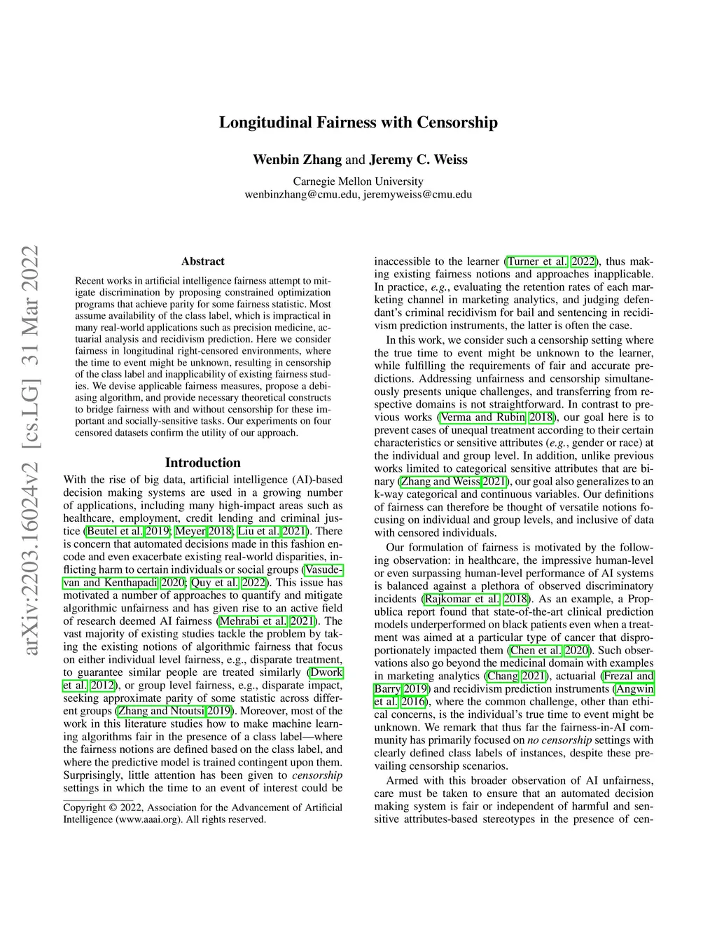 Recent works in artificial intelligence fairness attempt to mitigate discrimination by proposing constrained optimization programs that achieve parity for some fairness statistic. Most assume availability of the class label, which is impractical in many real-world applications such as precision medicine, actuarial analysis and recidivism prediction. Here we consider fairness in longitudinal right-censored environments, where the time to event might be unknown, resulting in censorship of the class label and inapplicability of existing fairness studies. We devise applicable fairness measures, propose a debiasing algorithm, and provide necessary theoretical constructs to bridge fairness with and without censorship for these important and socially-sensitive tasks. Our experiments on four censored datasets confirm the utility of our approach.