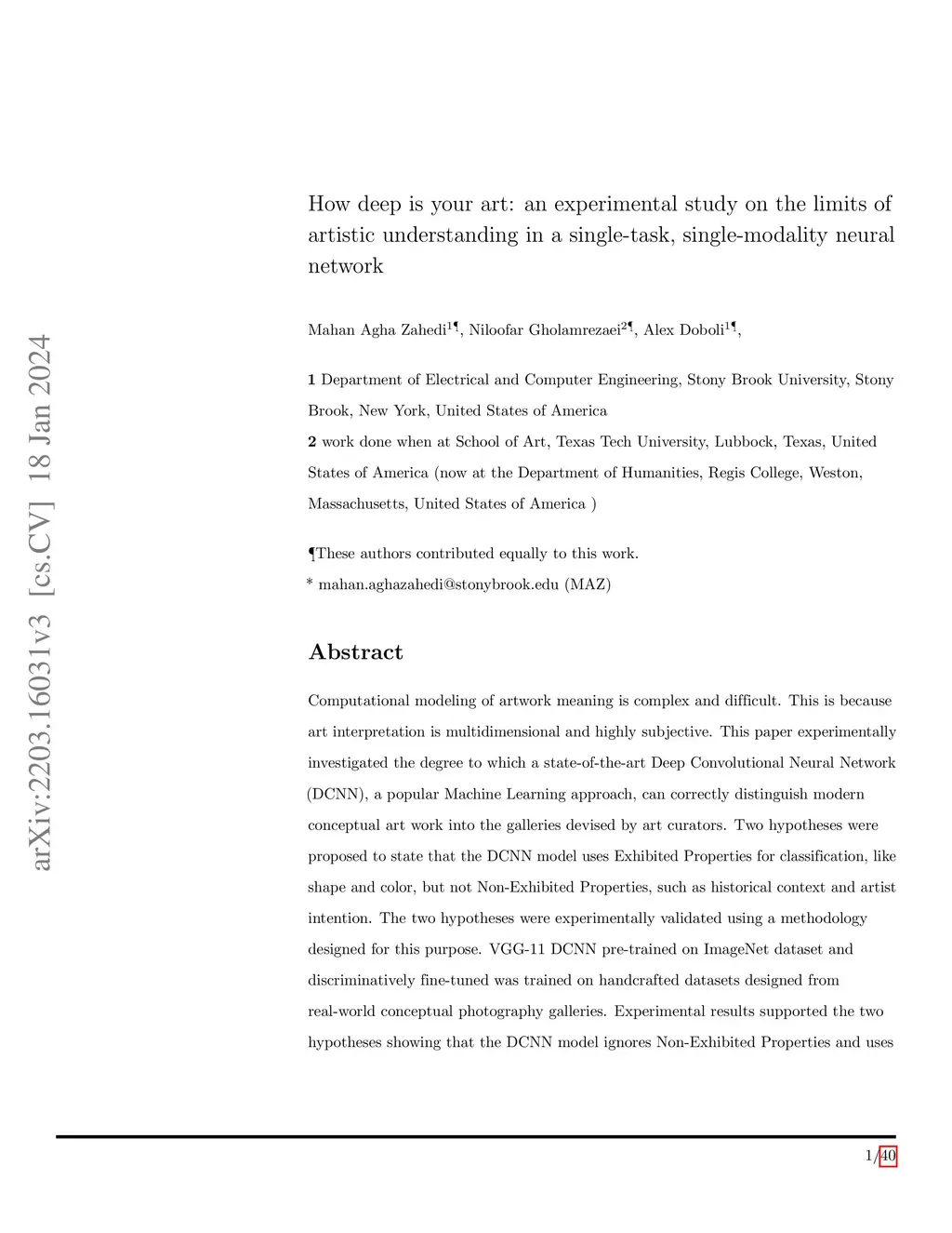 Mathematical modeling and aesthetic rule extraction of works of art are complex activities. This is because art is a multidimensional, subjective discipline. Perception and interpretation of art are, to many extents, relative and open-ended rather than measurable. Following the explainable Artificial Intelligence paradigm, this paper investigated in a human-understandable fashion the limits to which a single-task, single-modality benchmark computer vision model performs in classifying contemporary 2D visual arts. It is important to point out that this work does not introduce an interpreting method to open the black box of Deep Neural Networks, instead it uses existing evaluating metrics derived from the confusion matrix to try to uncover the mechanism with which Deep Neural Networks understand art. To achieve so, VGG-11, pre-trained on ImageNet and discriminatively fine-tuned, was used on handcrafted small-data datasets designed from real-world photography gallery shows. We demonstrated that the artwork's Exhibited Properties or formal factors such as shape and color, rather than Non-Exhibited Properties or content factors such as history and intention, have much higher potential to be the determinant when art pieces have very similar Exhibited Properties. We also showed that a single-task and single-modality model's understanding of art is inadequate as it largely ignores Non-Exhibited Properties.