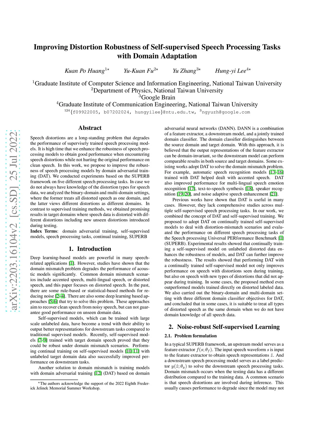 Speech distortions are a long-standing problem that degrades the performance of supervisely trained speech processing models. It is high time that we enhance the robustness of speech processing models to obtain good performance when encountering speech distortions while not hurting the original performance on clean speech. In this work, we propose to improve the robustness of speech processing models by domain adversarial training (DAT). We conducted experiments based on the SUPERB framework on five different speech processing tasks. In case we do not always have knowledge of the distortion types for speech data, we analyzed the binary-domain and multi-domain settings, where the former treats all distorted speech as one domain, and the latter views different distortions as different domains. In contrast to supervised training methods, we obtained promising results in target domains where speech data is distorted with different distortions including new unseen distortions introduced during testing.