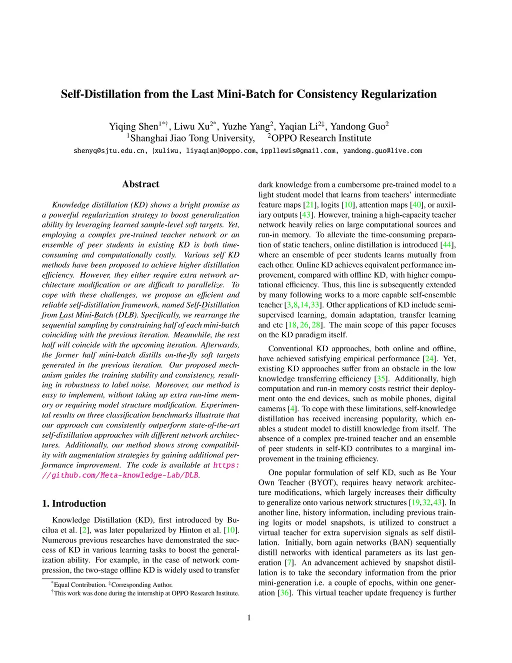Knowledge distillation (KD) shows a bright promise as a powerful regularization strategy to boost generalization ability by leveraging learned sample-level soft targets. Yet, employing a complex pre-trained teacher network or an ensemble of peer students in existing KD is both time-consuming and computationally costly. Various self KD methods have been proposed to achieve higher distillation efficiency. However, they either require extra network architecture modification or are difficult to parallelize. To cope with these challenges, we propose an efficient and reliable self-distillation framework, named Self-Distillation from Last Mini-Batch (DLB). Specifically, we rearrange the sequential sampling by constraining half of each mini-batch coinciding with the previous iteration. Meanwhile, the rest half will coincide with the upcoming iteration. Afterwards, the former half mini-batch distills on-the-fly soft targets generated in the previous iteration. Our proposed mechanism guides the training stability and consistency, resulting in robustness to label noise. Moreover, our method is easy to implement, without taking up extra run-time memory or requiring model structure modification. Experimental results on three classification benchmarks illustrate that our approach can consistently outperform state-of-the-art self-distillation approaches with different network architectures. Additionally, our method shows strong compatibility with augmentation strategies by gaining additional performance improvement. The code is available at https://github.com/Meta-knowledge-Lab/DLB.
