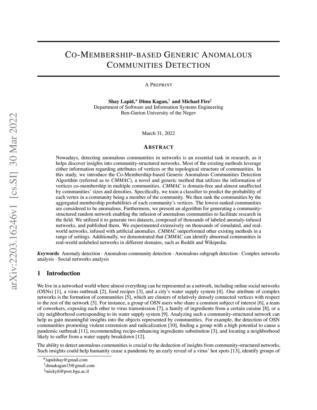 Nowadays, detecting anomalous communities in networks is an essential task in research, as it helps discover insights into community-structured networks. Most of the existing methods leverage either information regarding attributes of vertices or the topological structure of communities. In this study, we introduce the Co-Membership-based Generic Anomalous Communities Detection Algorithm (referred as to CMMAC), a novel and generic method that utilizes the information of vertices co-membership in multiple communities. CMMAC is domain-free and almost unaffected by communities' sizes and densities. Specifically, we train a classifier to predict the probability of each vertex in a community being a member of the community. We then rank the communities by the aggregated membership probabilities of each community's vertices. The lowest-ranked communities are considered to be anomalous. Furthermore, we present an algorithm for generating a community-structured random network enabling the infusion of anomalous communities to facilitate research in the field. We utilized it to generate two datasets, composed of thousands of labeled anomaly-infused networks, and published them. We experimented extensively on thousands of simulated, and real-world networks, infused with artificial anomalies. CMMAC outperformed other existing methods in a range of settings. Additionally, we demonstrated that CMMAC can identify abnormal communities in real-world unlabeled networks in different domains, such as Reddit and Wikipedia.