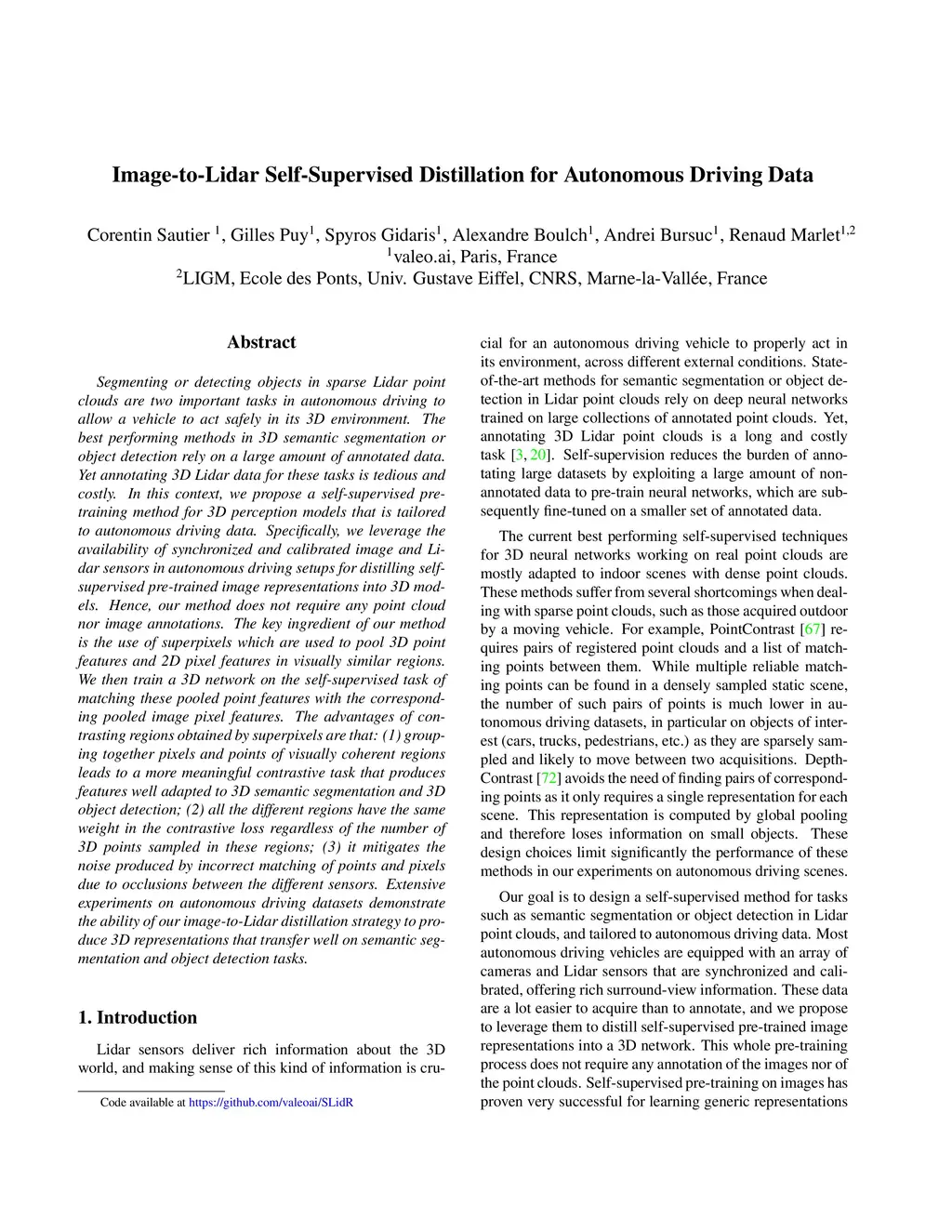 Segmenting or detecting objects in sparse Lidar point clouds are two important tasks in autonomous driving to allow a vehicle to act safely in its 3D environment. The best performing methods in 3D semantic segmentation or object detection rely on a large amount of annotated data. Yet annotating 3D Lidar data for these tasks is tedious and costly. In this context, we propose a self-supervised pre-training method for 3D perception models that is tailored to autonomous driving data. Specifically, we leverage the availability of synchronized and calibrated image and Lidar sensors in autonomous driving setups for distilling self-supervised pre-trained image representations into 3D models. Hence, our method does not require any point cloud nor image annotations. The key ingredient of our method is the use of superpixels which are used to pool 3D point features and 2D pixel features in visually similar regions. We then train a 3D network on the self-supervised task of matching these pooled point features with the corresponding pooled image pixel features. The advantages of contrasting regions obtained by superpixels are that: (1) grouping together pixels and points of visually coherent regions leads to a more meaningful contrastive task that produces features well adapted to 3D semantic segmentation and 3D object detection; (2) all the different regions have the same weight in the contrastive loss regardless of the number of 3D points sampled in these regions; (3) it mitigates the noise produced by incorrect matching of points and pixels due to occlusions between the different sensors. Extensive experiments on autonomous driving datasets demonstrate the ability of our image-to-Lidar distillation strategy to produce 3D representations that transfer well on semantic segmentation and object detection tasks.