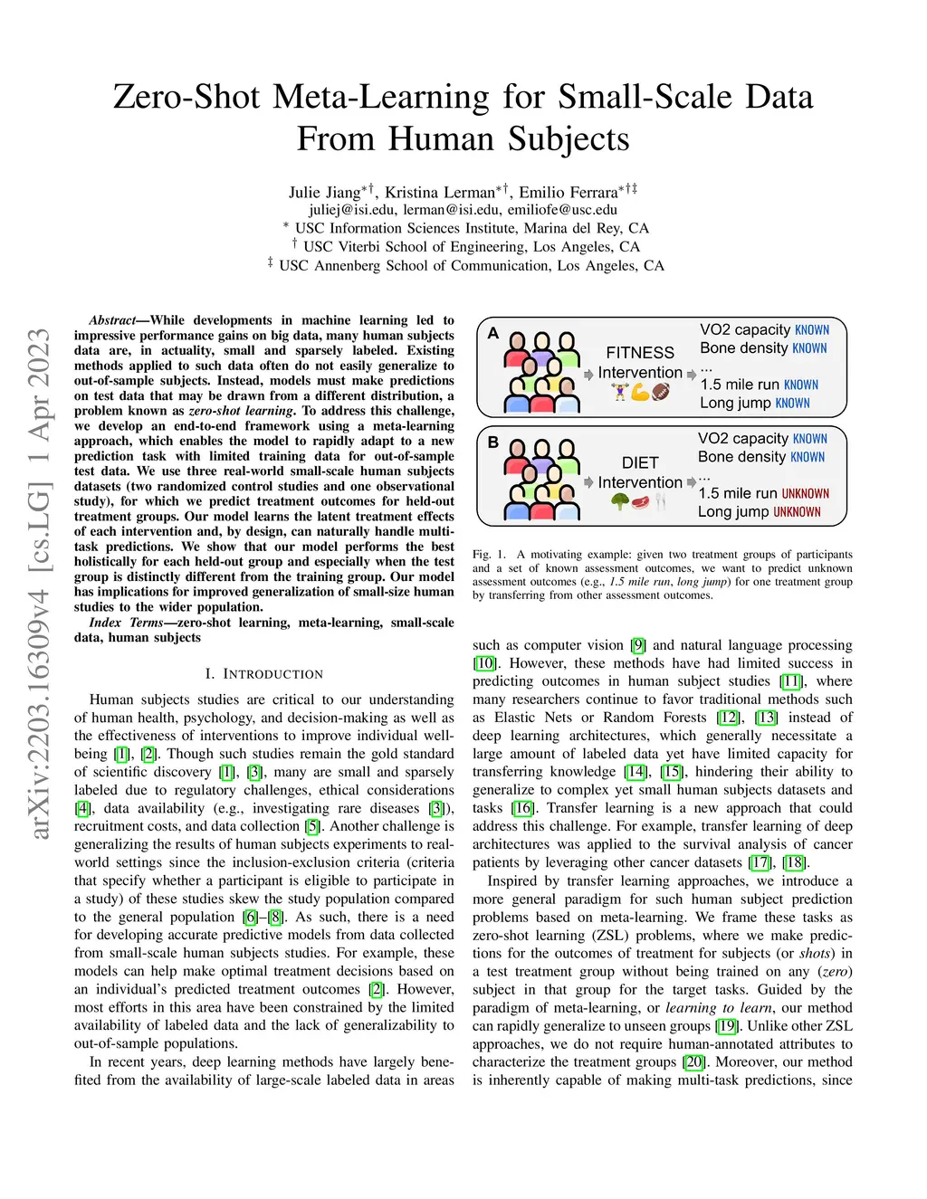 While developments in machine learning led to impressive performance gains on big data, many human subjects data are, in actuality, small and sparsely labeled. Existing methods applied to such data often do not easily generalize to out-of-sample subjects. Instead, models must make predictions on test data that may be drawn from a different distribution, a problem known as \textit{zero-shot learning}. To address this challenge, we develop an end-to-end framework using a meta-learning approach, which enables the model to rapidly adapt to a new prediction task with limited training data for out-of-sample test data. We use three real-world small-scale human subjects datasets (two randomized control studies and one observational study), for which we predict treatment outcomes for held-out treatment groups. Our model learns the latent treatment effects of each intervention and, by design, can naturally handle multi-task predictions. We show that our model performs the best holistically for each held-out group and especially when the test group is distinctly different from the training group. Our model has implications for improved generalization of small-size human studies to the wider population.