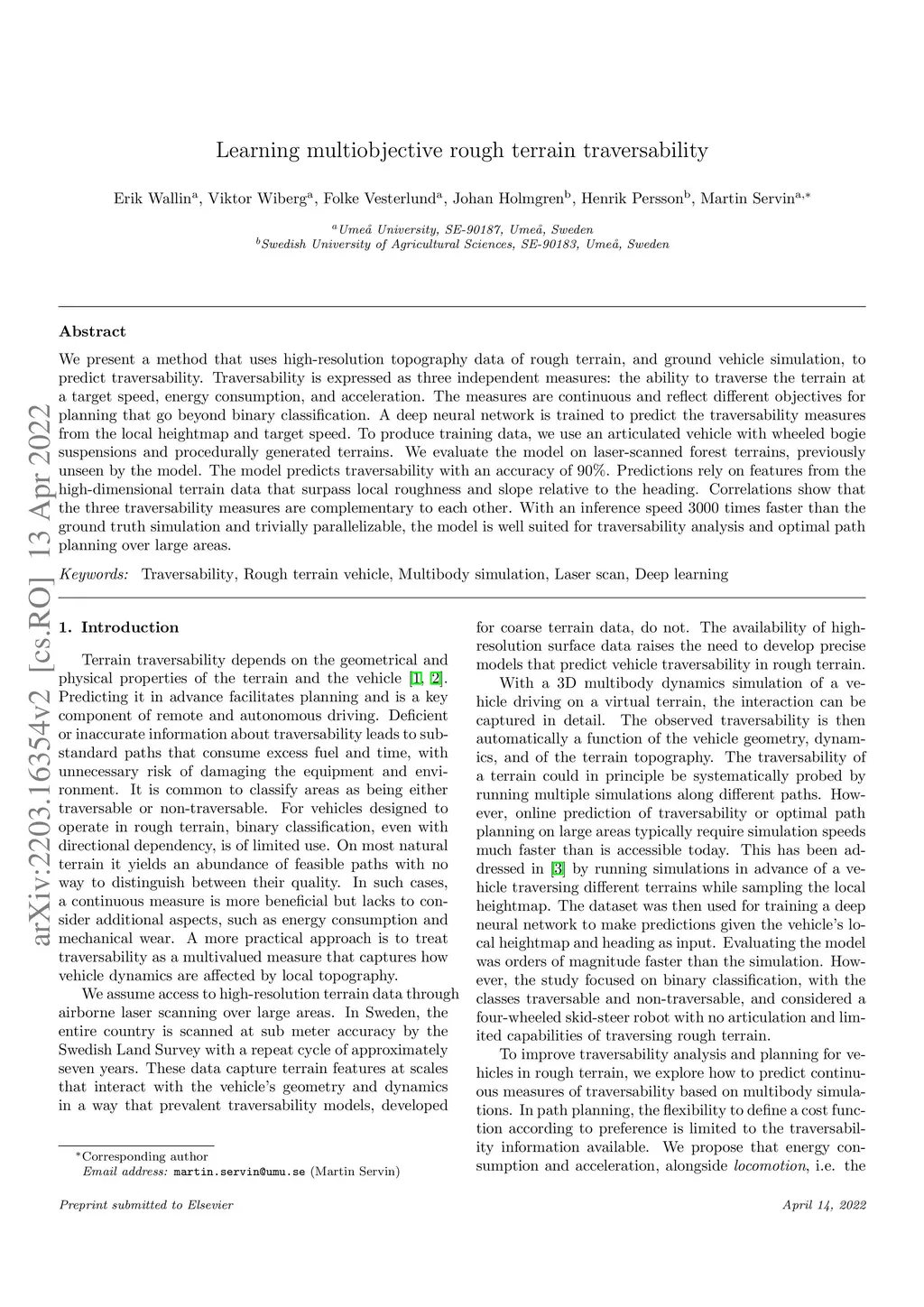 We present a method that uses high-resolution topography data of rough terrain, and ground vehicle simulation, to predict traversability. Traversability is expressed as three independent measures: the ability to traverse the terrain at a target speed, energy consumption, and acceleration. The measures are continuous and reflect different objectives for planning that go beyond binary classification. A deep neural network is trained to predict the traversability measures from the local heightmap and target speed. To produce training data, we use an articulated vehicle with wheeled bogie suspensions and procedurally generated terrains. We evaluate the model on laser-scanned forest terrains, previously unseen by the model. The model predicts traversability with an accuracy of 90%. Predictions rely on features from the high-dimensional terrain data that surpass local roughness and slope relative to the heading. Correlations show that the three traversability measures are complementary to each other. With an inference speed 3000 times faster than the ground truth simulation and trivially parallelizable, the model is well suited for traversability analysis and optimal path planning over large areas.
