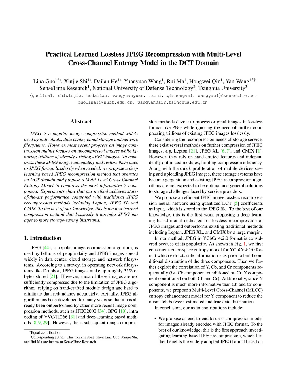 JPEG is a popular image compression method widely used by individuals, data center, cloud storage and network filesystems. However, most recent progress on image compression mainly focuses on uncompressed images while ignoring trillions of already-existing JPEG images. To compress these JPEG images adequately and restore them back to JPEG format losslessly when needed, we propose a deep learning based JPEG recompression method that operates on DCT domain and propose a Multi-Level Cross-Channel Entropy Model to compress the most informative Y component. Experiments show that our method achieves state-of-the-art performance compared with traditional JPEG recompression methods including Lepton, JPEG XL and CMIX. To the best of our knowledge, this is the first learned compression method that losslessly transcodes JPEG images to more storage-saving bitstreams.