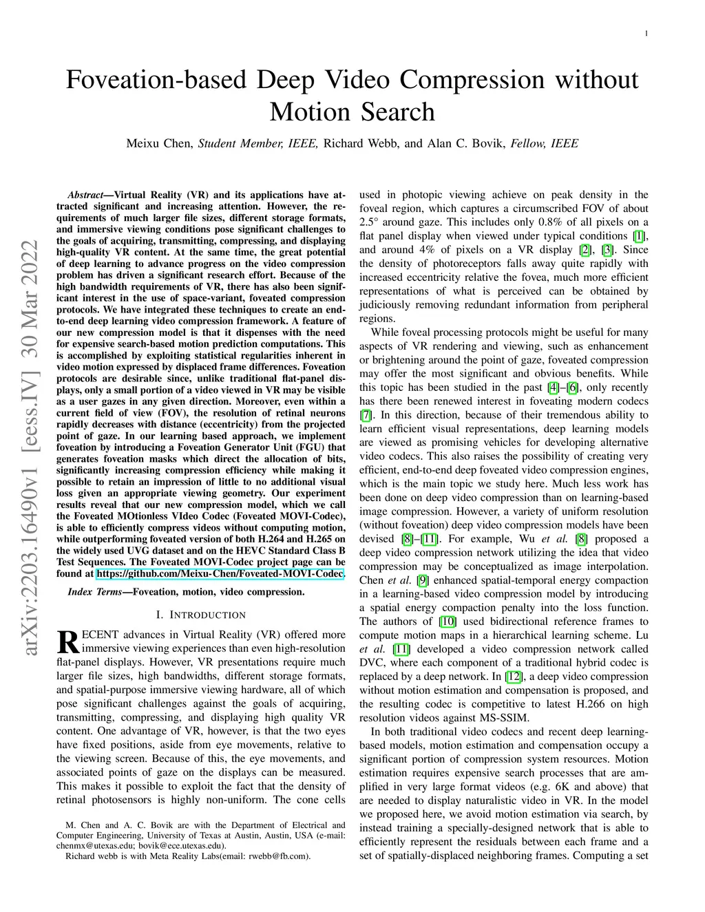 The requirements of much larger file sizes, different storage formats, and immersive viewing conditions of VR pose significant challenges to the goals of acquiring, transmitting, compressing, and displaying high-quality VR content. At the same time, the great potential of deep learning to advance progress on the video compression problem has driven a significant research effort. Because of the high bandwidth requirements of VR, there has also been significant interest in the use of space-variant, foveated compression protocols. We have integrated these techniques to create an end-to-end deep learning video compression framework. A feature of our new compression model is that it dispenses with the need for expensive search-based motion prediction computations. This is accomplished by exploiting statistical regularities inherent in video motion expressed by displaced frame differences. Foveation protocols are desirable since only a small portion of a video viewed in VR may be visible as a user gazes in any given direction. Moreover, even within a current field of view (FOV), the resolution of retinal neurons rapidly decreases with distance (eccentricity) from the projected point of gaze. In our learning based approach, we implement foveation by introducing a Foveation Generator Unit (FGU) that generates foveation masks which direct the allocation of bits, significantly increasing compression efficiency while making it possible to retain an impression of little to no additional visual loss given an appropriate viewing geometry. Our experiment results reveal that our new compression model, which we call the Foveated MOtionless VIdeo Codec (Foveated MOVI-Codec), is able to efficiently compress videos without computing motion, while outperforming foveated version of both H.264 and H.265 on the widely used UVG dataset and on the HEVC Standard Class B Test Sequences.