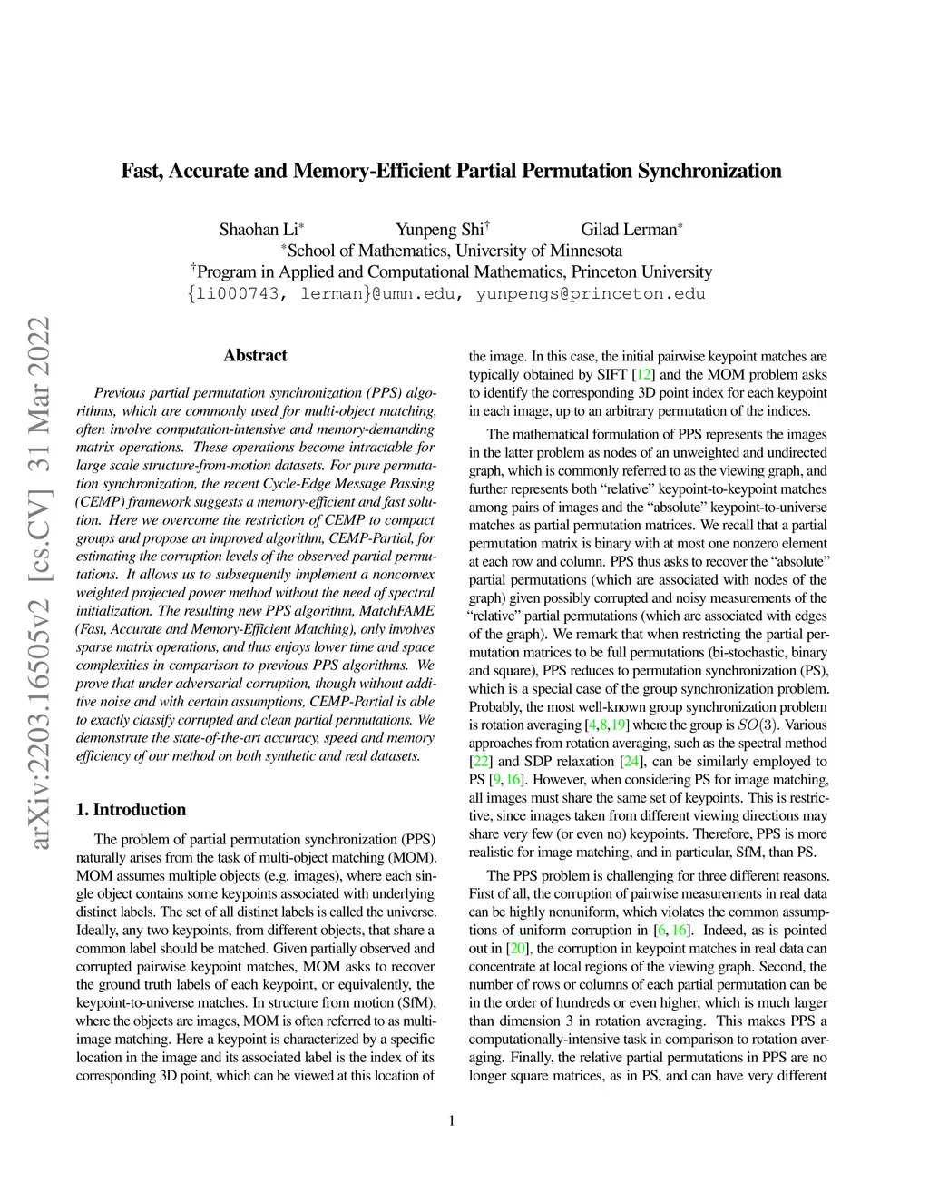 Previous partial permutation synchronization (PPS) algorithms, which are commonly used for multi-object matching, often involve computation-intensive and memory-demanding matrix operations. These operations become intractable for large scale structure-from-motion datasets. For pure permutation synchronization, the recent Cycle-Edge Message Passing (CEMP) framework suggests a memory-efficient and fast solution. Here we overcome the restriction of CEMP to compact groups and propose an improved algorithm, CEMP-Partial, for estimating the corruption levels of the observed partial permutations. It allows us to subsequently implement a nonconvex weighted projected power method without the need of spectral initialization. The resulting new PPS algorithm, MatchFAME (Fast, Accurate and Memory-Efficient Matching), only involves sparse matrix operations, and thus enjoys lower time and space complexities in comparison to previous PPS algorithms. We prove that under adversarial corruption, though without additive noise and with certain assumptions, CEMP-Partial is able to exactly classify corrupted and clean partial permutations. We demonstrate the state-of-the-art accuracy, speed and memory efficiency of our method on both synthetic and real datasets.