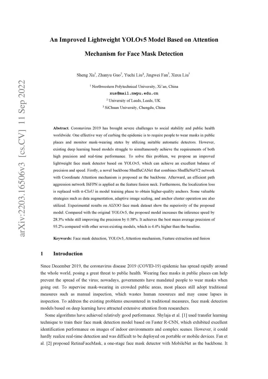 Coronavirus 2019 has brought severe challenges to social stability and public health worldwide. One effective way of curbing the epidemic is to require people to wear masks in public places and monitor mask-wearing states by utilizing suitable automatic detectors. However, existing deep learning based models struggle to simultaneously achieve the requirements of both high precision and real-time performance. To solve this problem, we propose an improved lightweight face mask detector based on YOLOv5, which can achieve an excellent balance of precision and speed. Firstly, a novel backbone ShuffleCANet that combines ShuffleNetV2 network with Coordinate Attention mechanism is proposed as the backbone. Afterwards, an efficient path aggression network BiFPN is applied as the feature fusion neck. Furthermore, the localization loss is replaced with alpha-CIoU in model training phase to obtain higher-quality anchors. Some valuable strategies such as data augmentation, adaptive image scaling, and anchor cluster operation are also utilized. Experimental results on AIZOO face mask dataset show the superiority of the proposed model. Compared with the original YOLOv5, the proposed model increases the inference speed by 28.3% while still improving the precision by 0.58%. It achieves the best mean average precision of 95.2% compared with other seven existing models, which is 4.4% higher than the baseline.