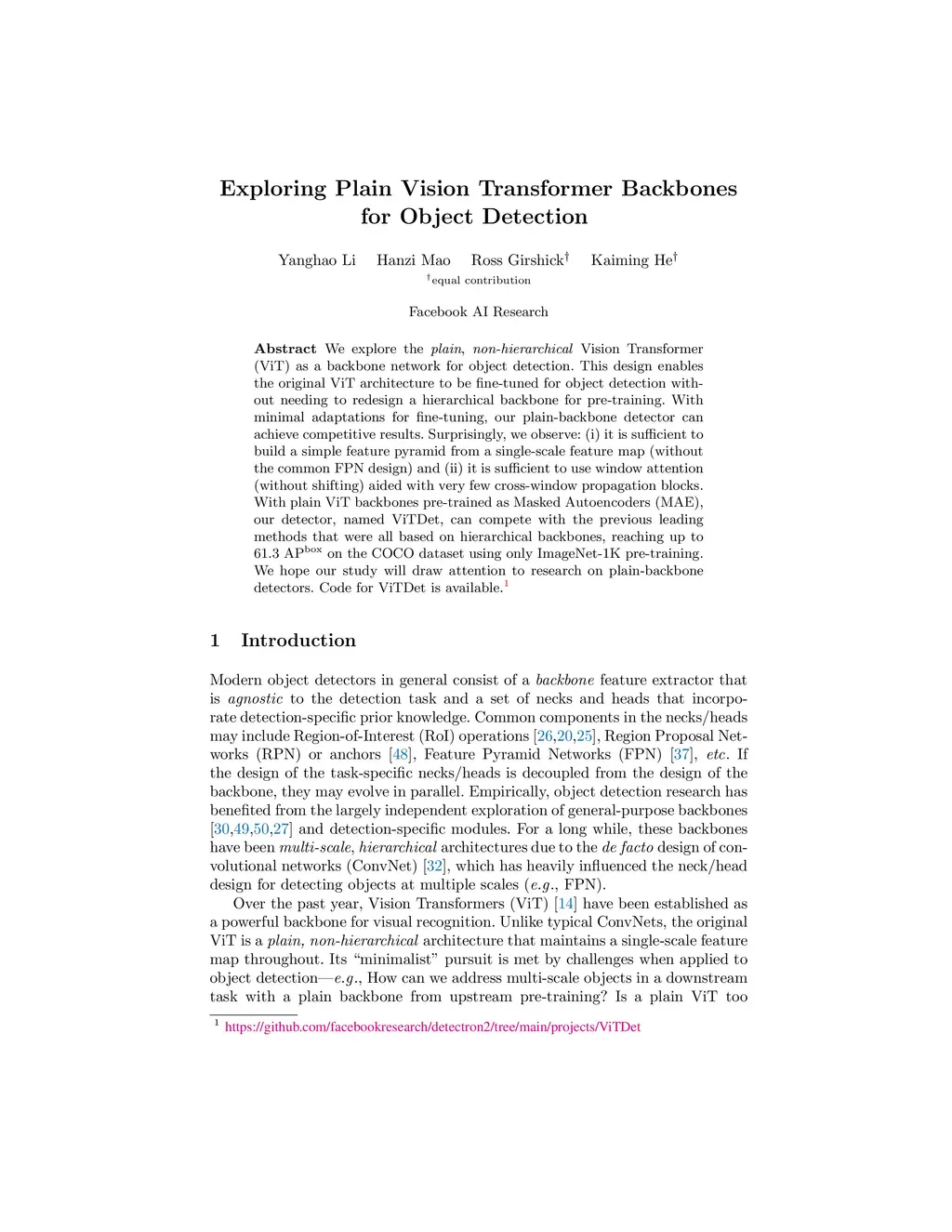 Exploring Plain Vision Transformer Backbones for Object Detection