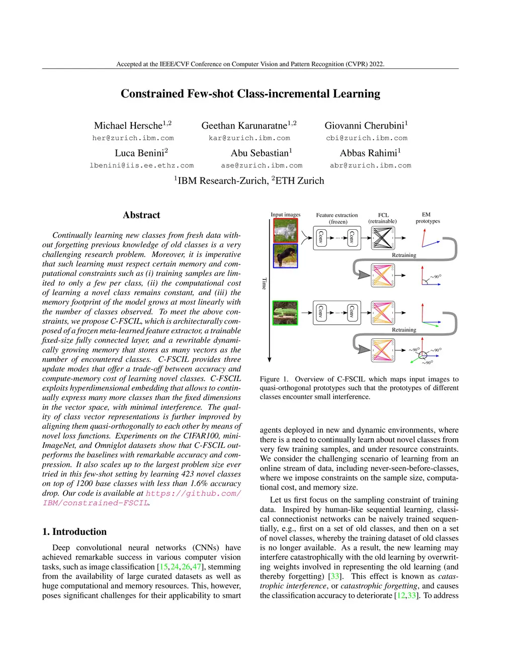 Continually learning new classes from fresh data without forgetting previous knowledge of old classes is a very challenging research problem. Moreover, it is imperative that such learning must respect certain memory and computational constraints such as (i) training samples are limited to only a few per class, (ii) the computational cost of learning a novel class remains constant, and (iii) the memory footprint of the model grows at most linearly with the number of classes observed. To meet the above constraints, we propose C-FSCIL, which is architecturally composed of a frozen meta-learned feature extractor, a trainable fixed-size fully connected layer, and a rewritable dynamically growing memory that stores as many vectors as the number of encountered classes. C-FSCIL provides three update modes that offer a trade-off between accuracy and compute-memory cost of learning novel classes. C-FSCIL exploits hyperdimensional embedding that allows to continually express many more classes than the fixed dimensions in the vector space, with minimal interference. The quality of class vector representations is further improved by aligning them quasi-orthogonally to each other by means of novel loss functions. Experiments on the CIFAR100, miniImageNet, and Omniglot datasets show that C-FSCIL outperforms the baselines with remarkable accuracy and compression. It also scales up to the largest problem size ever tried in this few-shot setting by learning 423 novel classes on top of 1200 base classes with less than 1.6% accuracy drop. Our code is available at https://github.com/IBM/constrained-FSCIL.