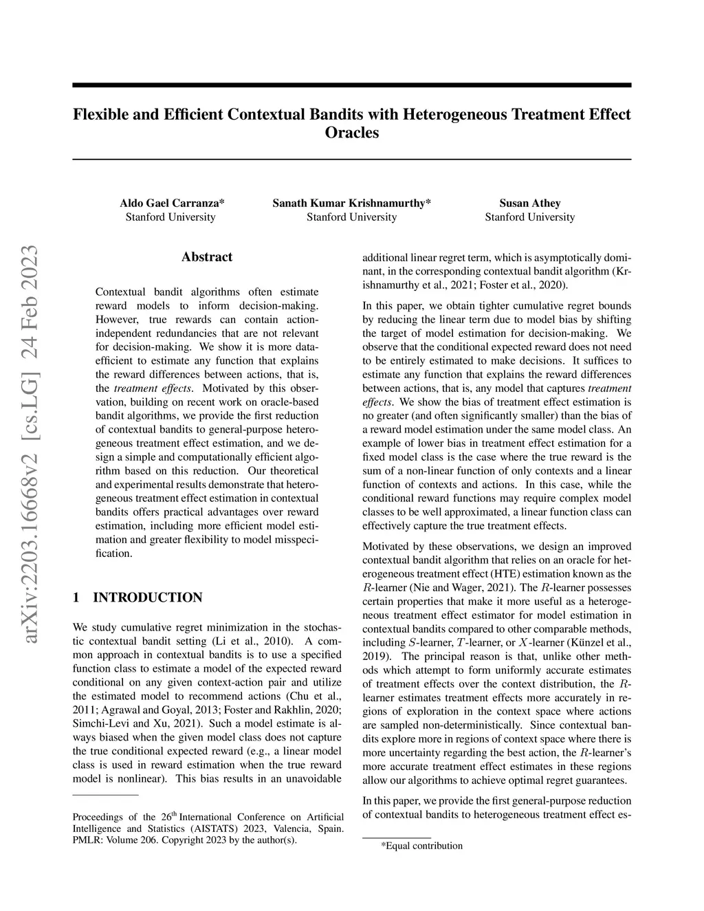 Contextual bandit algorithms often estimate reward models to inform decision-making. However, true rewards can contain action-independent redundancies that are not relevant for decision-making. We show it is more data-efficient to estimate any function that explains the reward differences between actions, that is, the treatment effects. Motivated by this observation, building on recent work on oracle-based bandit algorithms, we provide the first reduction of contextual bandits to general-purpose heterogeneous treatment effect estimation, and we design a simple and computationally efficient algorithm based on this reduction. Our theoretical and experimental results demonstrate that heterogeneous treatment effect estimation in contextual bandits offers practical advantages over reward estimation, including more efficient model estimation and greater flexibility to model misspecification.