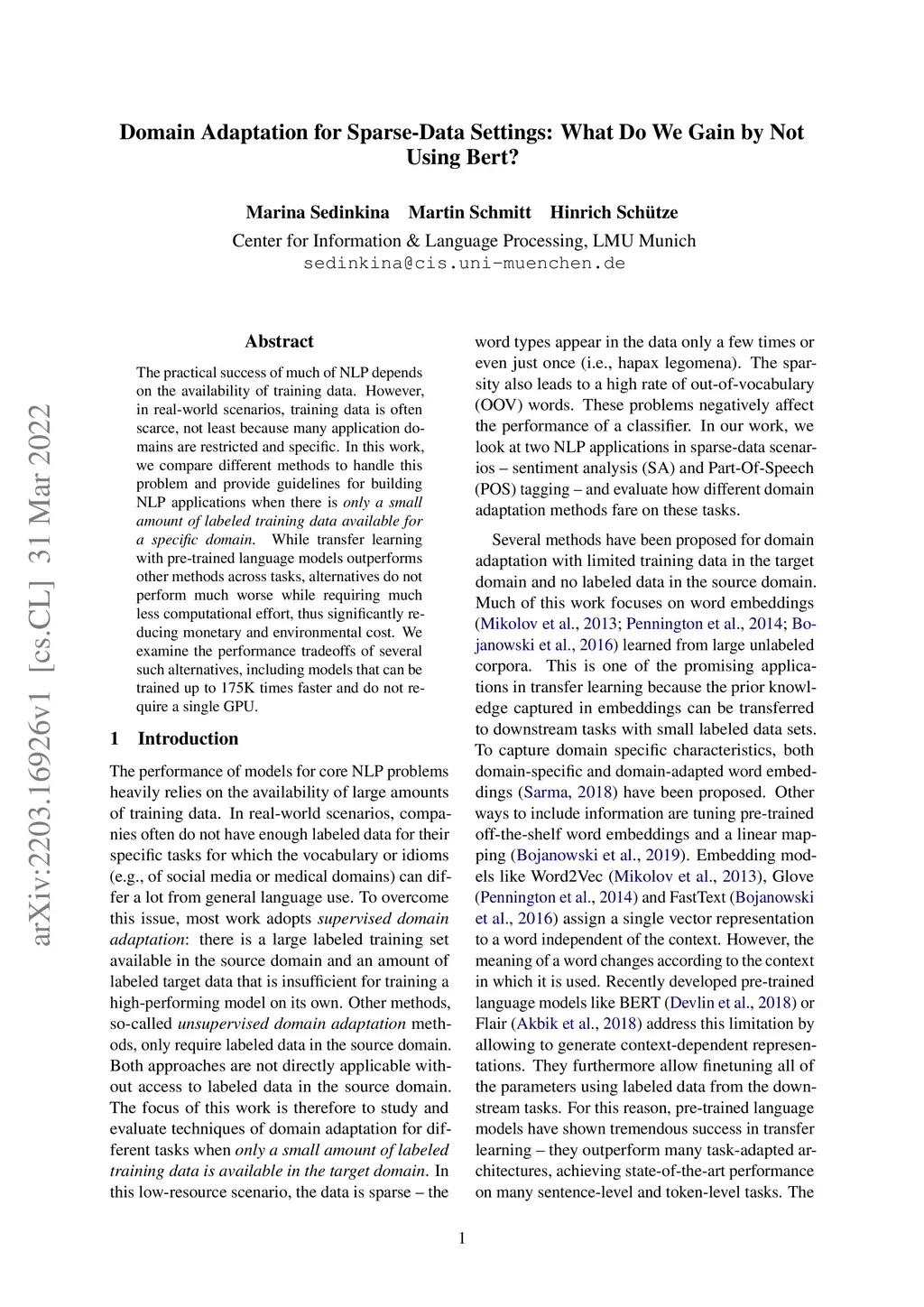 The practical success of much of NLP depends on the availability of training data. However, in real-world scenarios, training data is often scarce, not least because many application domains are restricted and specific. In this work, we compare different methods to handle this problem and provide guidelines for building NLP applications when there is only a small amount of labeled training data available for a specific domain. While transfer learning with pre-trained language models outperforms other methods across tasks, alternatives do not perform much worse while requiring much less computational effort, thus significantly reducing monetary and environmental cost. We examine the performance tradeoffs of several such alternatives, including models that can be trained up to 175K times faster and do not require a single GPU.