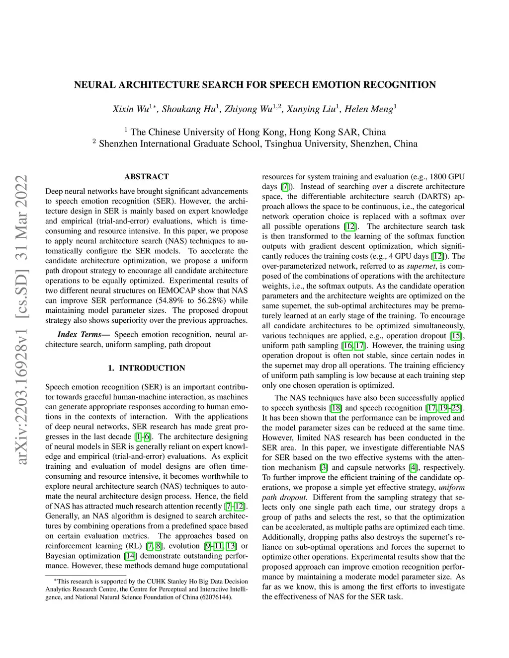 Deep neural networks have brought significant advancements to speech emotion recognition (SER). However, the architecture design in SER is mainly based on expert knowledge and empirical (trial-and-error) evaluations, which is time-consuming and resource intensive. In this paper, we propose to apply neural architecture search (NAS) techniques to automatically configure the SER models. To accelerate the candidate architecture optimization, we propose a uniform path dropout strategy to encourage all candidate architecture operations to be equally optimized. Experimental results of two different neural structures on IEMOCAP show that NAS can improve SER performance (54.89\% to 56.28\%) while maintaining model parameter sizes. The proposed dropout strategy also shows superiority over the previous approaches.