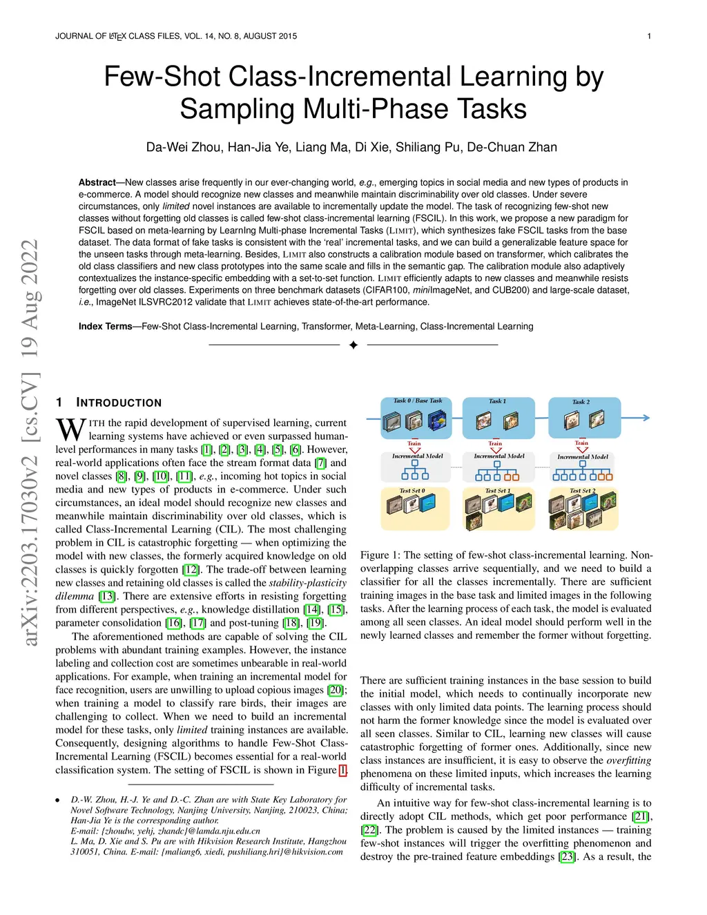 New classes arise frequently in our ever-changing world, e.g., emerging topics in social media and new types of products in e-commerce. A model should recognize new classes and meanwhile maintain discriminability over old classes. Under severe circumstances, only limited novel instances are available to incrementally update the model. The task of recognizing few-shot new classes without forgetting old classes is called few-shot class-incremental learning (FSCIL). In this work, we propose a new paradigm for FSCIL based on meta-learning by LearnIng Multi-phase Incremental Tasks (LIMIT), which synthesizes fake FSCIL tasks from the base dataset. The data format of fake tasks is consistent with the `real' incremental tasks, and we can build a generalizable feature space for the unseen tasks through meta-learning. Besides, LIMIT also constructs a calibration module based on transformer, which calibrates the old class classifiers and new class prototypes into the same scale and fills in the semantic gap. The calibration module also adaptively contextualizes the instance-specific embedding with a set-to-set function. LIMIT efficiently adapts to new classes and meanwhile resists forgetting over old classes. Experiments on three benchmark datasets (CIFAR100, miniImageNet, and CUB200) and large-scale dataset, i.e., ImageNet ILSVRC2012 validate that LIMIT achieves state-of-the-art performance.