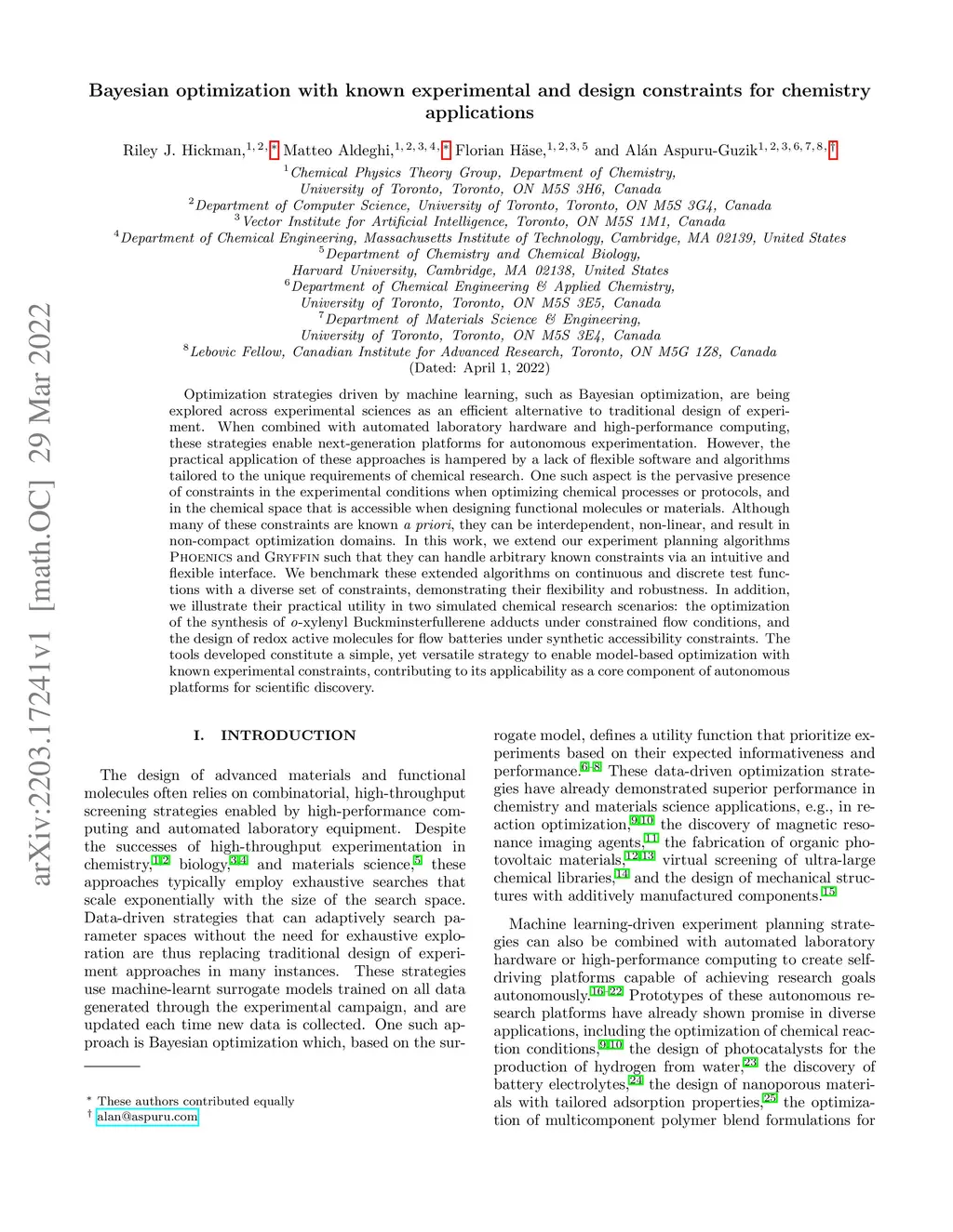 Optimization strategies driven by machine learning, such as Bayesian optimization, are being explored across experimental sciences as an efficient alternative to traditional design of experiment. When combined with automated laboratory hardware and high-performance computing, these strategies enable next-generation platforms for autonomous experimentation. However, the practical application of these approaches is hampered by a lack of flexible software and algorithms tailored to the unique requirements of chemical research. One such aspect is the pervasive presence of constraints in the experimental conditions when optimizing chemical processes or protocols, and in the chemical space that is accessible when designing functional molecules or materials. Although many of these constraints are known a priori, they can be interdependent, non-linear, and result in non-compact optimization domains. In this work, we extend our experiment planning algorithms Phoenics and Gryffin such that they can handle arbitrary known constraints via an intuitive and flexible interface. We benchmark these extended algorithms on continuous and discrete test functions with a diverse set of constraints, demonstrating their flexibility and robustness. In addition, we illustrate their practical utility in two simulated chemical research scenarios: the optimization of the synthesis of o-xylenyl Buckminsterfullerene adducts under constrained flow conditions, and the design of redox active molecules for flow batteries under synthetic accessibility constraints. The tools developed constitute a simple, yet versatile strategy to enable model-based optimization with known experimental constraints, contributing to its applicability as a core component of autonomous platforms for scientific discovery.