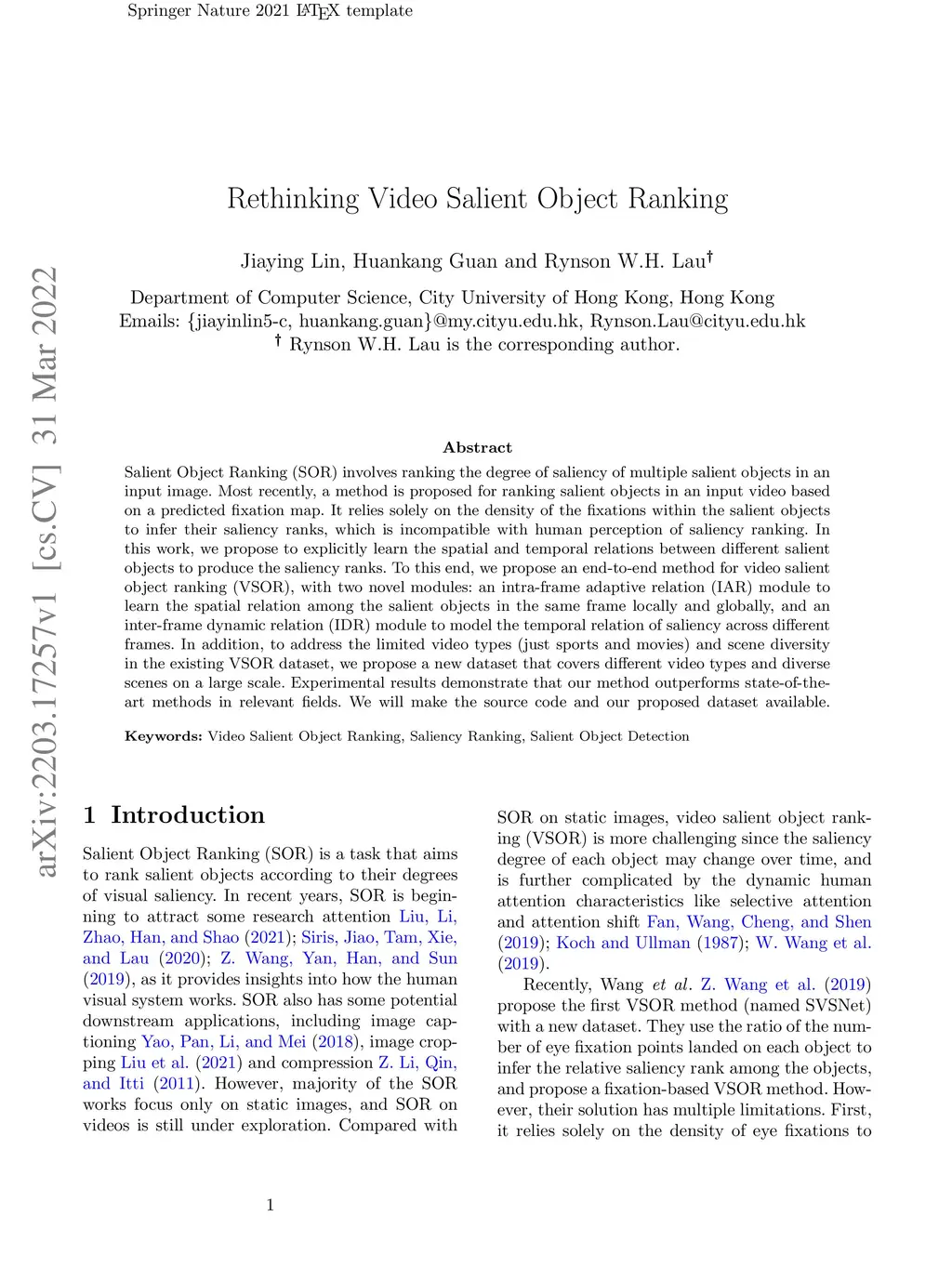 Salient Object Ranking (SOR) involves ranking the degree of saliency of multiple salient objects in an input image. Most recently, a method is proposed for ranking salient objects in an input video based on a predicted fixation map. It relies solely on the density of the fixations within the salient objects to infer their saliency ranks, which is incompatible with human perception of saliency ranking. In this work, we propose to explicitly learn the spatial and temporal relations between different salient objects to produce the saliency ranks. To this end, we propose an end-to-end method for video salient object ranking (VSOR), with two novel modules: an intra-frame adaptive relation (IAR) module to learn the spatial relation among the salient objects in the same frame locally and globally, and an inter-frame dynamic relation (IDR) module to model the temporal relation of saliency across different frames. In addition, to address the limited video types (just sports and movies) and scene diversity in the existing VSOR dataset, we propose a new dataset that covers different video types and diverse scenes on a large scale. Experimental results demonstrate that our method outperforms state-of-the-art methods in relevant fields. We will make the source code and our proposed dataset available.