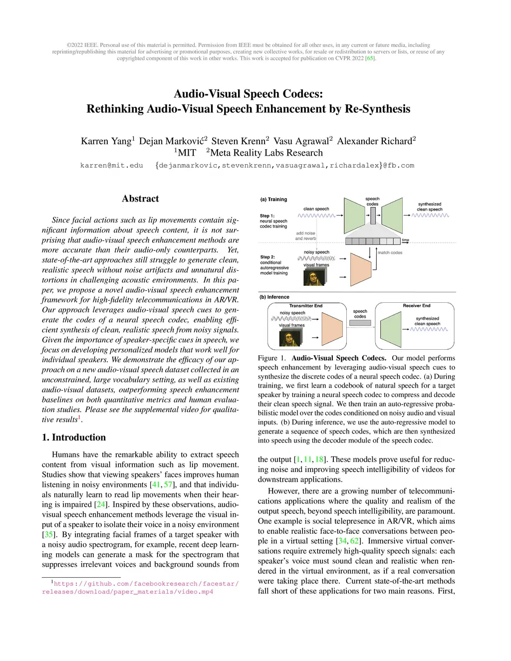 Since facial actions such as lip movements contain significant information about speech content, it is not surprising that audio-visual speech enhancement methods are more accurate than their audio-only counterparts. Yet, state-of-the-art approaches still struggle to generate clean, realistic speech without noise artifacts and unnatural distortions in challenging acoustic environments. In this paper, we propose a novel audio-visual speech enhancement framework for high-fidelity telecommunications in AR/VR. Our approach leverages audio-visual speech cues to generate the codes of a neural speech codec, enabling efficient synthesis of clean, realistic speech from noisy signals. Given the importance of speaker-specific cues in speech, we focus on developing personalized models that work well for individual speakers. We demonstrate the efficacy of our approach on a new audio-visual speech dataset collected in an unconstrained, large vocabulary setting, as well as existing audio-visual datasets, outperforming speech enhancement baselines on both quantitative metrics and human evaluation studies. Please see the supplemental video for qualitative results at https://github.com/facebookresearch/facestar/releases/download/paper_materials/video.mp4.
