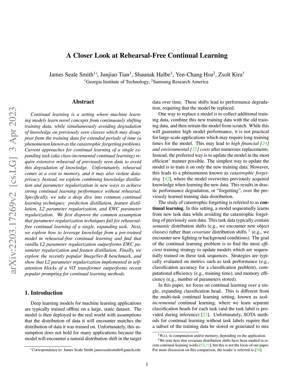 Continual learning is a setting where machine learning models learn novel concepts from continuously shifting training data, while simultaneously avoiding degradation of knowledge on previously seen classes which may disappear from the training data for extended periods of time (a phenomenon known as the catastrophic forgetting problem). Current approaches for continual learning of a single expanding task (aka class-incremental continual learning) require extensive rehearsal of previously seen data to avoid this degradation of knowledge. Unfortunately, rehearsal comes at a cost to memory, and it may also violate data-privacy. Instead, we explore combining knowledge distillation and parameter regularization in new ways to achieve strong continual learning performance without rehearsal. Specifically, we take a deep dive into common continual learning techniques: prediction distillation, feature distillation, L2 parameter regularization, and EWC parameter regularization. We first disprove the common assumption that parameter regularization techniques fail for rehearsal-free continual learning of a single, expanding task. Next, we explore how to leverage knowledge from a pre-trained model in rehearsal-free continual learning and find that vanilla L2 parameter regularization outperforms EWC parameter regularization and feature distillation. Finally, we explore the recently popular ImageNet-R benchmark, and show that L2 parameter regularization implemented in self-attention blocks of a ViT transformer outperforms recent popular prompting for continual learning methods.