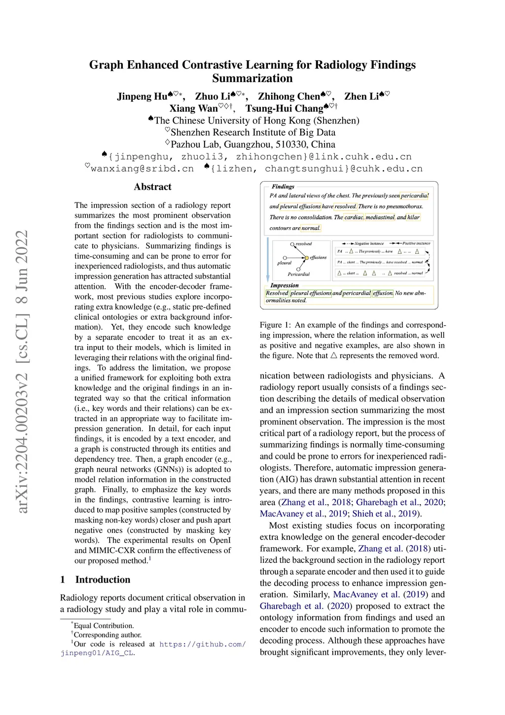 Graph Enhanced Contrastive Learning for Radiology Findings Summarization