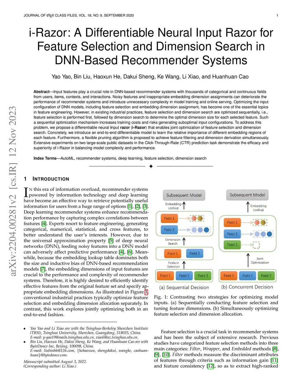 Input features play a crucial role in DNN-based recommender systems with thousands of categorical and continuous fields from users, items, contexts, and interactions. Noisy features and inappropriate embedding dimension assignments can deteriorate the performance of recommender systems and introduce unnecessary complexity in model training and online serving. Optimizing the input configuration of DNN models, including feature selection and embedding dimension assignment, has become one of the essential topics in feature engineering. However, in existing industrial practices, feature selection and dimension search are optimized sequentially, i.e., feature selection is performed first, followed by dimension search to determine the optimal dimension size for each selected feature. Such a sequential optimization mechanism increases training costs and risks generating suboptimal input configurations. To address this problem, we propose a differentiable neural input razor (i-Razor) that enables joint optimization of feature selection and dimension search. Concretely, we introduce an end-to-end differentiable model to learn the relative importance of different embedding regions of each feature. Furthermore, a flexible pruning algorithm is proposed to achieve feature filtering and dimension derivation simultaneously. Extensive experiments on two large-scale public datasets in the Click-Through-Rate (CTR) prediction task demonstrate the efficacy and superiority of i-Razor in balancing model complexity and performance.