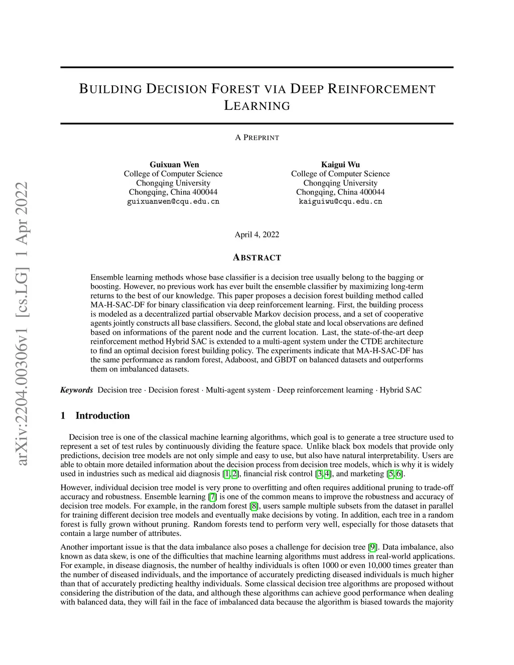 Ensemble learning methods whose base classifier is a decision tree usually belong to the bagging or boosting. However, no previous work has ever built the ensemble classifier by maximizing long-term returns to the best of our knowledge. This paper proposes a decision forest building method called MA-H-SAC-DF for binary classification via deep reinforcement learning. First, the building process is modeled as a decentralized partial observable Markov decision process, and a set of cooperative agents jointly constructs all base classifiers. Second, the global state and local observations are defined based on informations of the parent node and the current location. Last, the state-of-the-art deep reinforcement method Hybrid SAC is extended to a multi-agent system under the CTDE architecture to find an optimal decision forest building policy. The experiments indicate that MA-H-SAC-DF has the same performance as random forest, Adaboost, and GBDT on balanced datasets and outperforms them on imbalanced datasets.