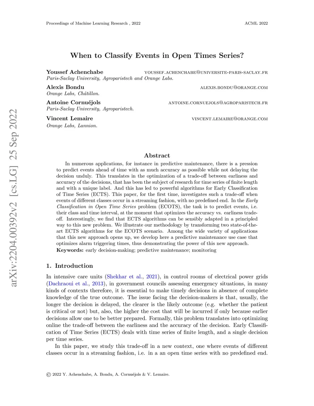 In numerous applications, for instance in predictive maintenance, there is a pression to predict events ahead of time with as much accuracy as possible while not delaying the decision unduly. This translates in the optimization of a trade-off between earliness and accuracy of the decisions, that has been the subject of research for time series of finite length and with a unique label. And this has led to powerful algorithms for Early Classification of Time Series (ECTS). This paper, for the first time, investigates such a trade-off when events of different classes occur in a streaming fashion, with no predefined end. In the Early Classification in Open Time Series problem (ECOTS), the task is to predict events, i.e. their class and time interval, at the moment that optimizes the accuracy vs. earliness trade-off. Interestingly, we find that ECTS algorithms can be sensibly adapted in a principled way to this new problem. We illustrate our methodology by transforming two state-of-the-art ECTS algorithms for the ECOTS scenario. Among the wide variety of applications that this new approach opens up, we develop a predictive maintenance use case that optimizes alarm triggering times, thus demonstrating the power of this new approach.