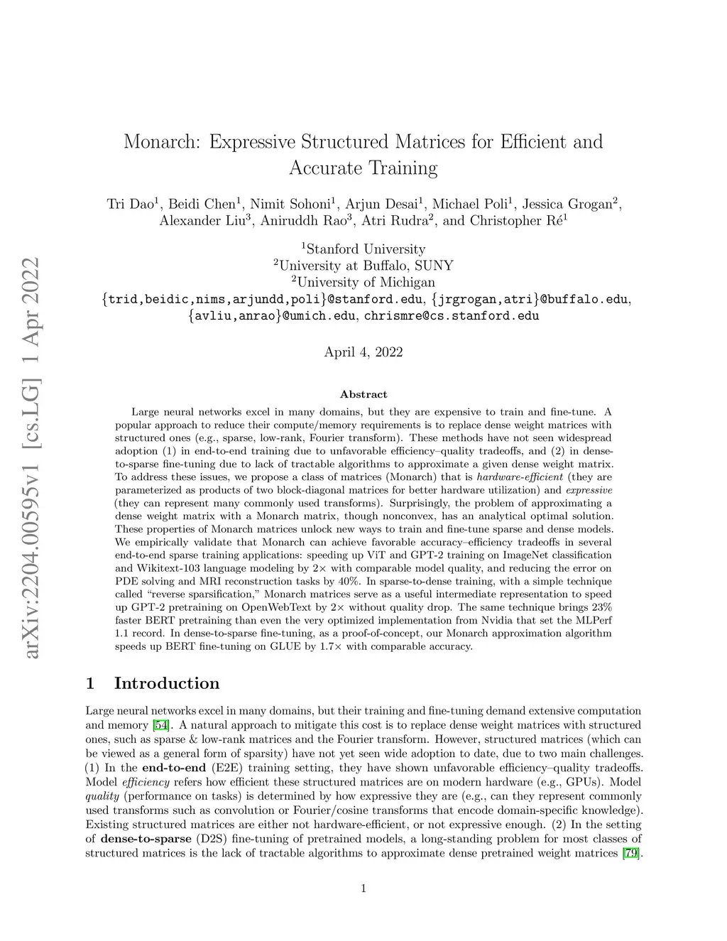 Large neural networks excel in many domains, but they are expensive to train and fine-tune. A popular approach to reduce their compute or memory requirements is to replace dense weight matrices with structured ones (e.g., sparse, low-rank, Fourier transform). These methods have not seen widespread adoption (1) in end-to-end training due to unfavorable efficiency--quality tradeoffs, and (2) in dense-to-sparse fine-tuning due to lack of tractable algorithms to approximate a given dense weight matrix. To address these issues, we propose a class of matrices (Monarch) that is hardware-efficient (they are parameterized as products of two block-diagonal matrices for better hardware utilization) and expressive (they can represent many commonly used transforms). Surprisingly, the problem of approximating a dense weight matrix with a Monarch matrix, though nonconvex, has an analytical optimal solution. These properties of Monarch matrices unlock new ways to train and fine-tune sparse and dense models. We empirically validate that Monarch can achieve favorable accuracy-efficiency tradeoffs in several end-to-end sparse training applications: speeding up ViT and GPT-2 training on ImageNet classification and Wikitext-103 language modeling by 2x with comparable model quality, and reducing the error on PDE solving and MRI reconstruction tasks by 40%. In sparse-to-dense training, with a simple technique called "reverse sparsification," Monarch matrices serve as a useful intermediate representation to speed up GPT-2 pretraining on OpenWebText by 2x without quality drop. The same technique brings 23% faster BERT pretraining than even the very optimized implementation from Nvidia that set the MLPerf 1.1 record. In dense-to-sparse fine-tuning, as a proof-of-concept, our Monarch approximation algorithm speeds up BERT fine-tuning on GLUE by 1.7x with comparable accuracy.