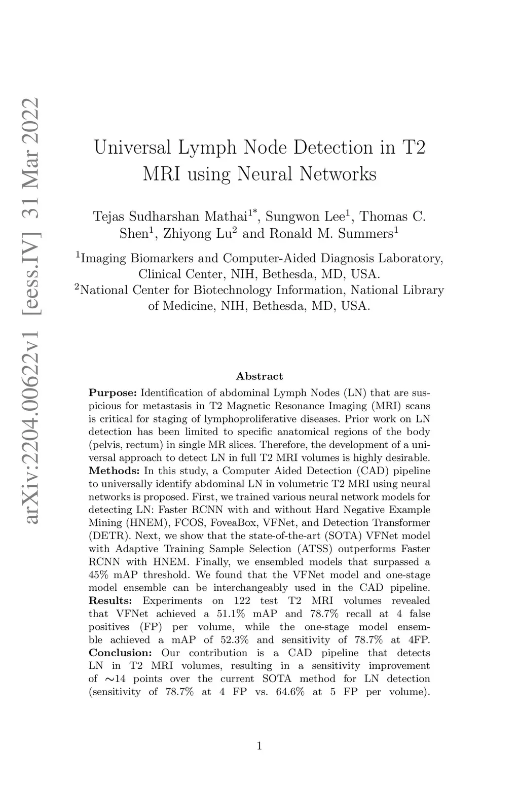 Universal Lymph Node Detection in T2 MRI using Neural Networks