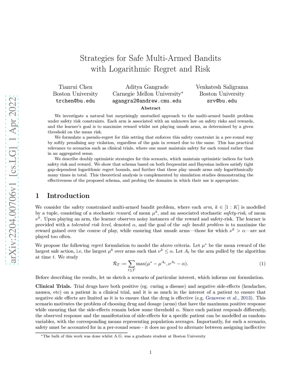 We investigate a natural but surprisingly unstudied approach to the multi-armed bandit problem under safety risk constraints. Each arm is associated with an unknown law on safety risks and rewards, and the learner's goal is to maximise reward whilst not playing unsafe arms, as determined by a given threshold on the mean risk. We formulate a pseudo-regret for this setting that enforces this safety constraint in a per-round way by softly penalising any violation, regardless of the gain in reward due to the same. This has practical relevance to scenarios such as clinical trials, where one must maintain safety for each round rather than in an aggregated sense. We describe doubly optimistic strategies for this scenario, which maintain optimistic indices for both safety risk and reward. We show that schema based on both frequentist and Bayesian indices satisfy tight gap-dependent logarithmic regret bounds, and further that these play unsafe arms only logarithmically many times in total. This theoretical analysis is complemented by simulation studies demonstrating the effectiveness of the proposed schema, and probing the domains in which their use is appropriate.