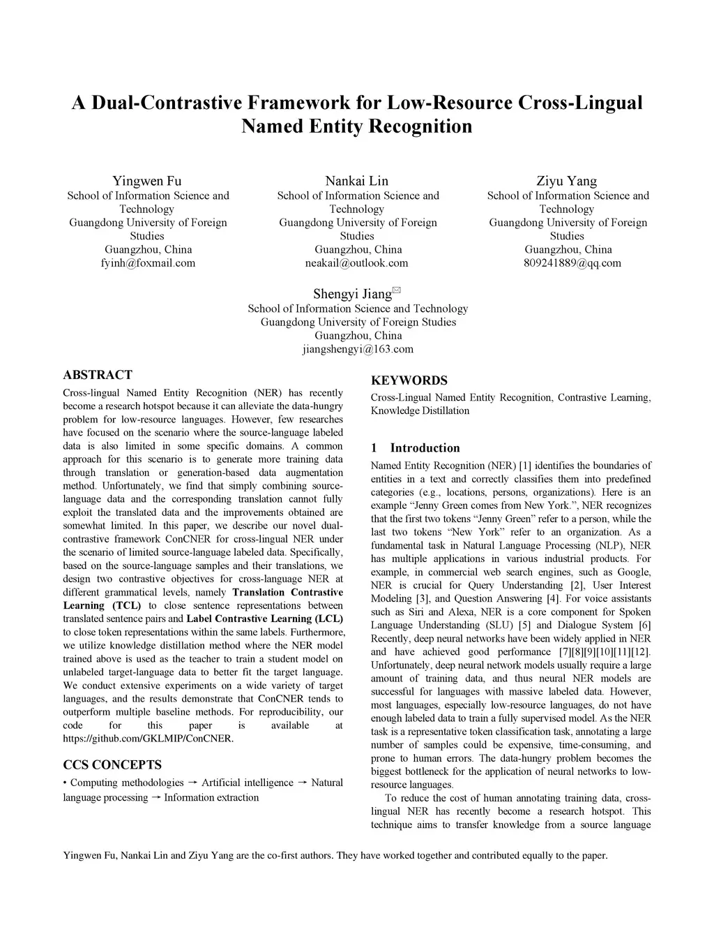 A Dual-Contrastive Framework for Low-Resource Cross-Lingual Named Entity