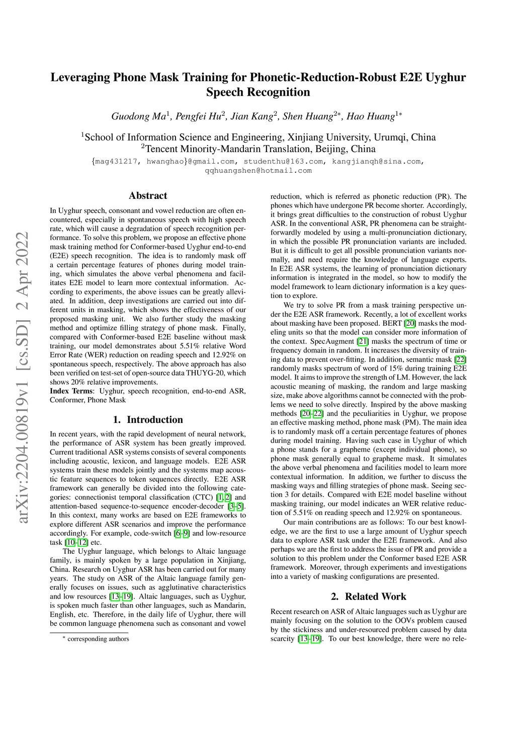 In Uyghur speech, consonant and vowel reduction are often encountered, especially in spontaneous speech with high speech rate, which will cause a degradation of speech recognition performance. To solve this problem, we propose an effective phone mask training method for Conformer-based Uyghur end-to-end (E2E) speech recognition. The idea is to randomly mask off a certain percentage features of phones during model training, which simulates the above verbal phenomena and facilitates E2E model to learn more contextual information. According to experiments, the above issues can be greatly alleviated. In addition, deep investigations are carried out into different units in masking, which shows the effectiveness of our proposed masking unit. We also further study the masking method and optimize filling strategy of phone mask. Finally, compared with Conformer-based E2E baseline without mask training, our model demonstrates about 5.51% relative Word Error Rate (WER) reduction on reading speech and 12.92% on spontaneous speech, respectively. The above approach has also been verified on test-set of open-source data THUYG-20, which shows 20% relative improvements.