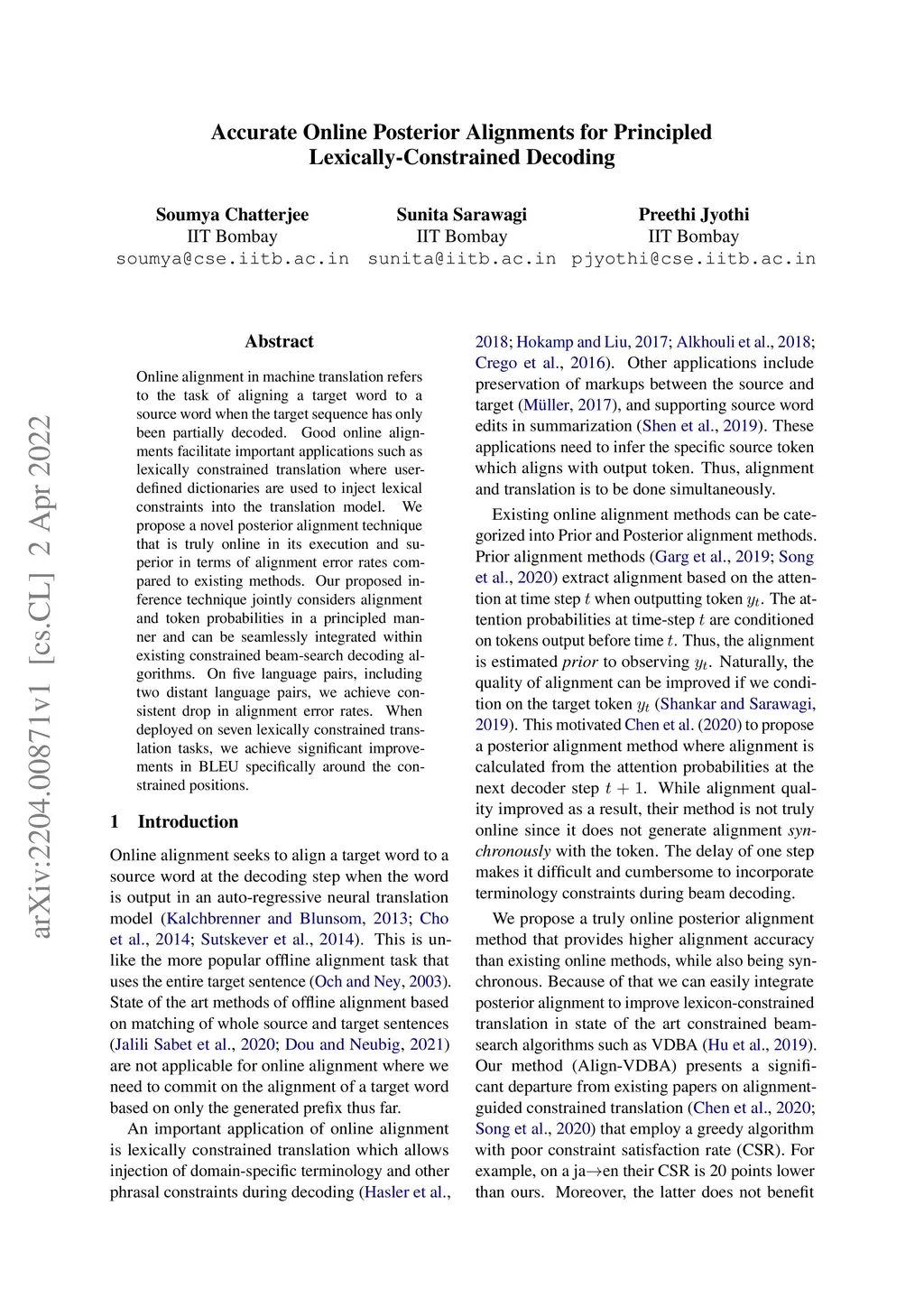 Online alignment in machine translation refers to the task of aligning a target word to a source word when the target sequence has only been partially decoded. Good online alignments facilitate important applications such as lexically constrained translation where user-defined dictionaries are used to inject lexical constraints into the translation model. We propose a novel posterior alignment technique that is truly online in its execution and superior in terms of alignment error rates compared to existing methods. Our proposed inference technique jointly considers alignment and token probabilities in a principled manner and can be seamlessly integrated within existing constrained beam-search decoding algorithms. On five language pairs, including two distant language pairs, we achieve consistent drop in alignment error rates. When deployed on seven lexically constrained translation tasks, we achieve significant improvements in BLEU specifically around the constrained positions.