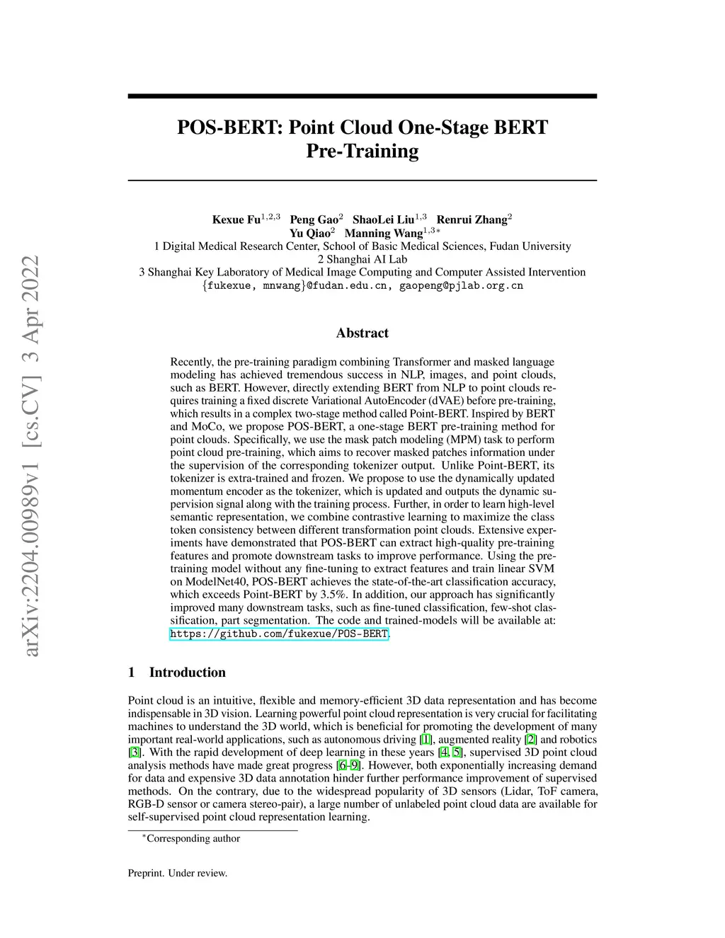 POS-BERT: Point Cloud One-Stage BERT Pre-Training