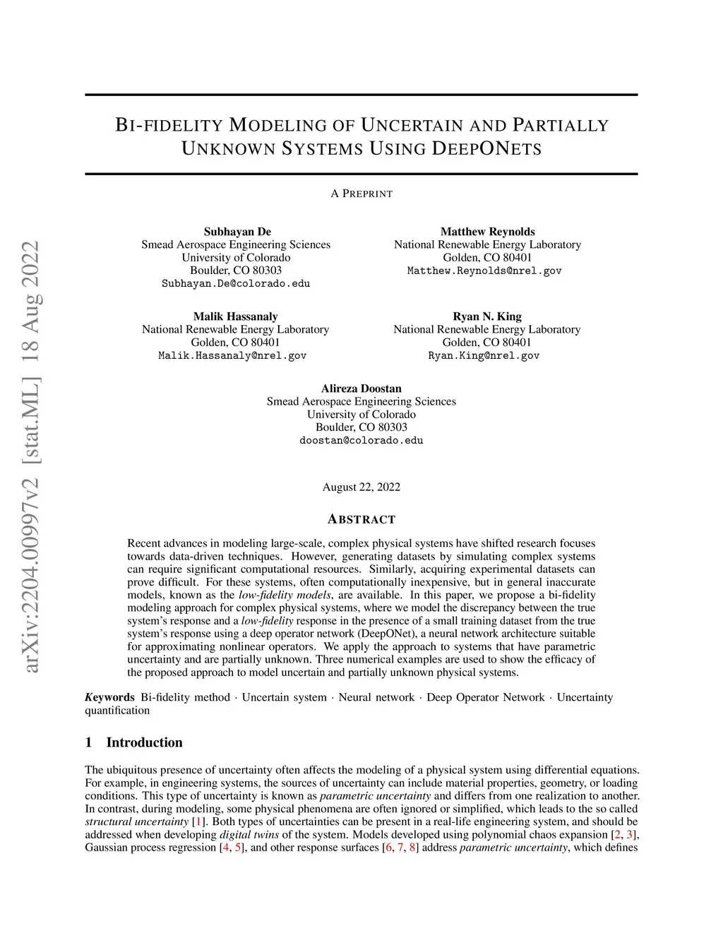 Recent advances in modeling large-scale complex physical systems have shifted research focuses towards data-driven techniques. However, generating datasets by simulating complex systems can require significant computational resources. Similarly, acquiring experimental datasets can prove difficult as well. For these systems, often computationally inexpensive, but in general inaccurate, models, known as the low-fidelity models, are available. In this paper, we propose a bi-fidelity modeling approach for complex physical systems, where we model the discrepancy between the true system's response and low-fidelity response in the presence of a small training dataset from the true system's response using a deep operator network (DeepONet), a neural network architecture suitable for approximating nonlinear operators. We apply the approach to model systems that have parametric uncertainty and are partially unknown. Three numerical examples are used to show the efficacy of the proposed approach to model uncertain and partially unknown complex physical systems.