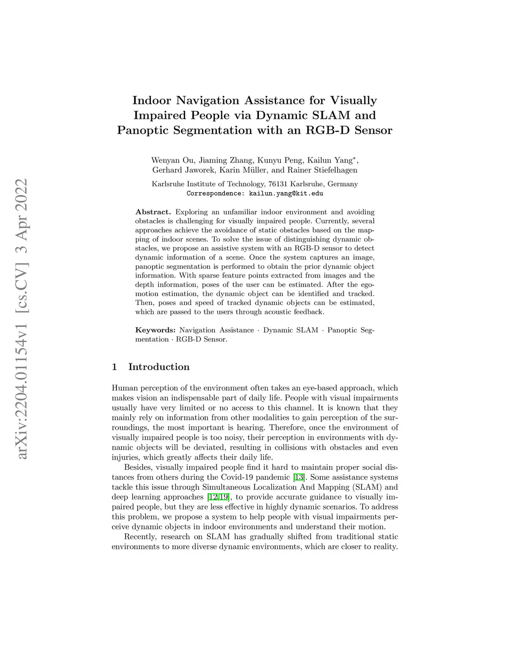 Exploring an unfamiliar indoor environment and avoiding obstacles is challenging for visually impaired people. Currently, several approaches achieve the avoidance of static obstacles based on the mapping of indoor scenes. To solve the issue of distinguishing dynamic obstacles, we propose an assistive system with an RGB-D sensor to detect dynamic information of a scene. Once the system captures an image, panoptic segmentation is performed to obtain the prior dynamic object information. With sparse feature points extracted from images and the depth information, poses of the user can be estimated. After the ego-motion estimation, the dynamic object can be identified and tracked. Then, poses and speed of tracked dynamic objects can be estimated, which are passed to the users through acoustic feedback.