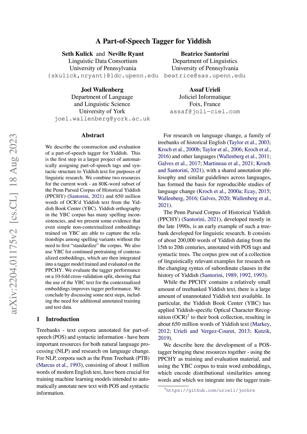A Part-of-Speech Tagger for Yiddish