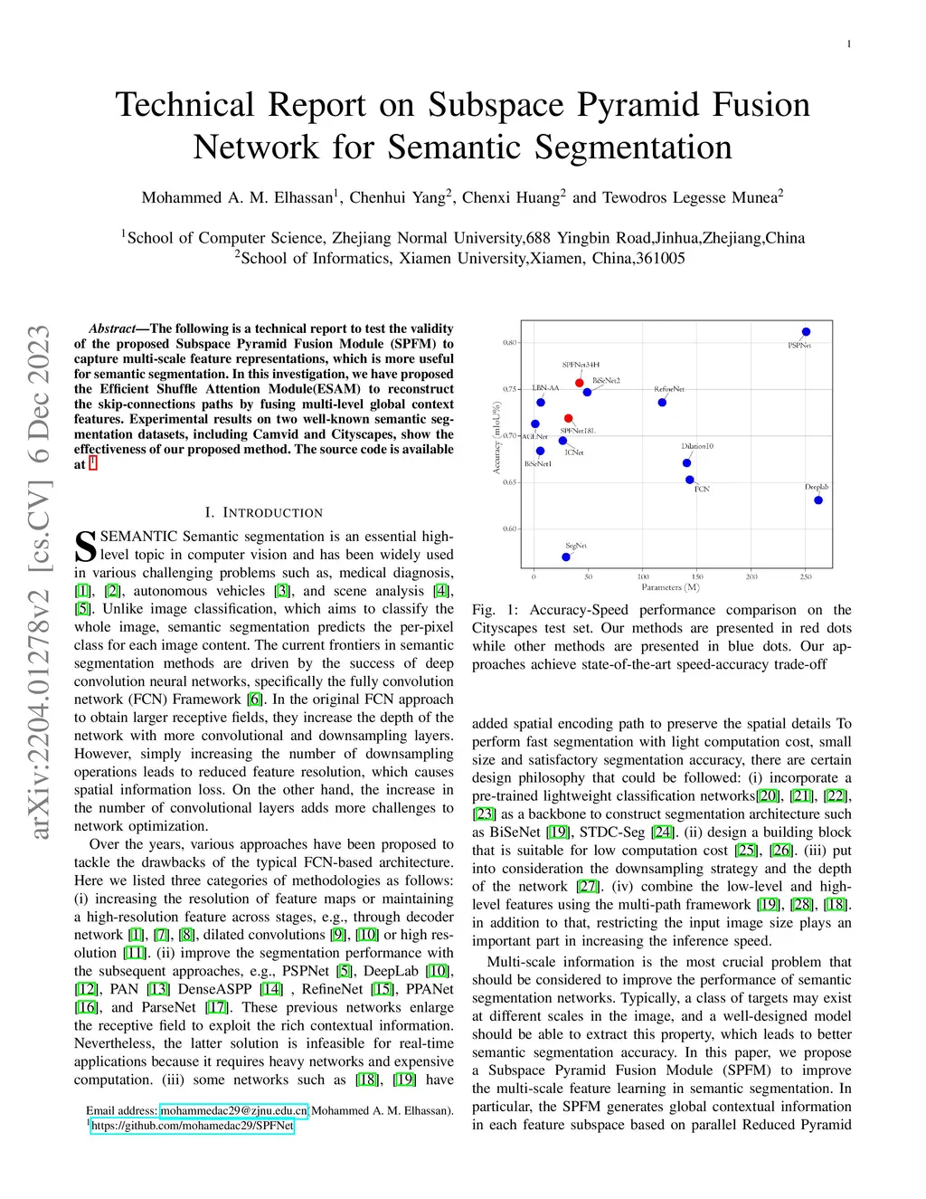 The following is a technical report to test the validity of the proposed Subspace Pyramid Fusion Module (SPFM) to capture multi-scale feature representations, which is more useful for semantic segmentation. In this investigation, we have proposed the Efficient Shuffle Attention Module(ESAM) to reconstruct the skip-connections paths by fusing multi-level global context features. Experimental results on two well-known semantic segmentation datasets, including Camvid and Cityscapes, show the effectiveness of our proposed method.