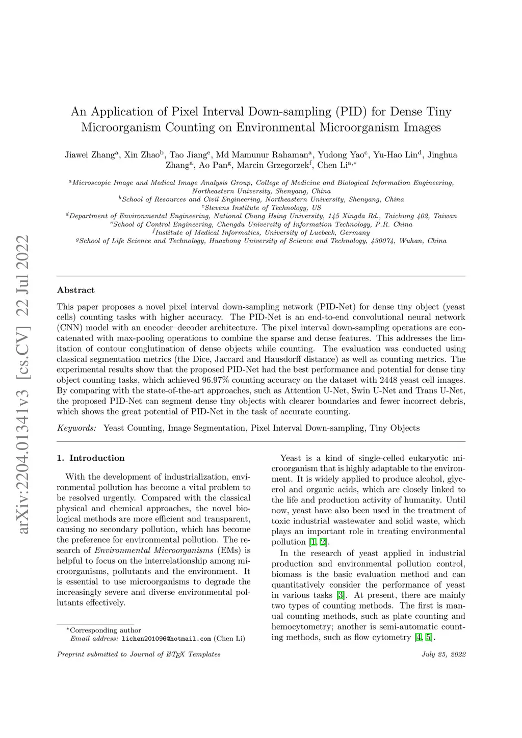 This paper proposes a novel pixel interval down-sampling network (PID-Net) for dense tiny object (yeast cells) counting tasks with higher accuracy. The PID-Net is an end-to-end convolutional neural network (CNN) model with an encoder--decoder architecture. The pixel interval down-sampling operations are concatenated with max-pooling operations to combine the sparse and dense features. This addresses the limitation of contour conglutination of dense objects while counting. The evaluation was conducted using classical segmentation metrics (the Dice, Jaccard and Hausdorff distance) as well as counting metrics. The experimental results show that the proposed PID-Net had the best performance and potential for dense tiny object counting tasks, which achieved 96.97\% counting accuracy on the dataset with 2448 yeast cell images. By comparing with the state-of-the-art approaches, such as Attention U-Net, Swin U-Net and Trans U-Net, the proposed PID-Net can segment dense tiny objects with clearer boundaries and fewer incorrect debris, which shows the great potential of PID-Net in the task of accurate counting.
