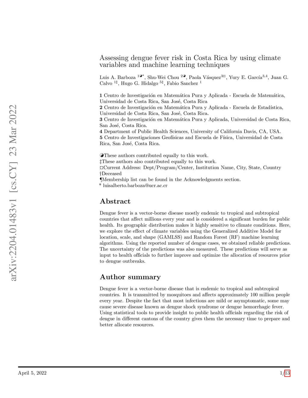 Assessing dengue fever risk in Costa Rica by using climate variables and