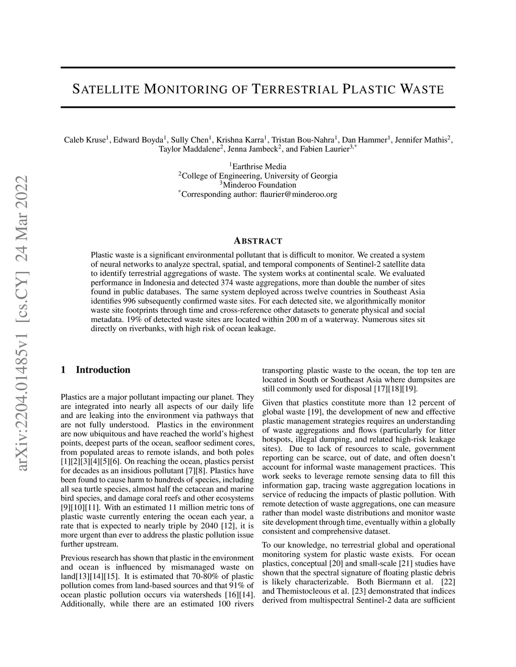 Plastic waste is a significant environmental pollutant that is difficult to monitor. We created a system of neural networks to analyze spectral, spatial, and temporal components of Sentinel-2 satellite data to identify terrestrial aggregations of waste. The system works at continental scale. We evaluated performance in Indonesia and detected 374 waste aggregations, more than double the number of sites found in public databases. The same system deployed across twelve countries in Southeast Asia identifies 996 subsequently confirmed waste sites. For each detected site, we algorithmically monitor waste site footprints through time and cross-reference other datasets to generate physical and social metadata. 19% of detected waste sites are located within 200 m of a waterway. Numerous sites sit directly on riverbanks, with high risk of ocean leakage.